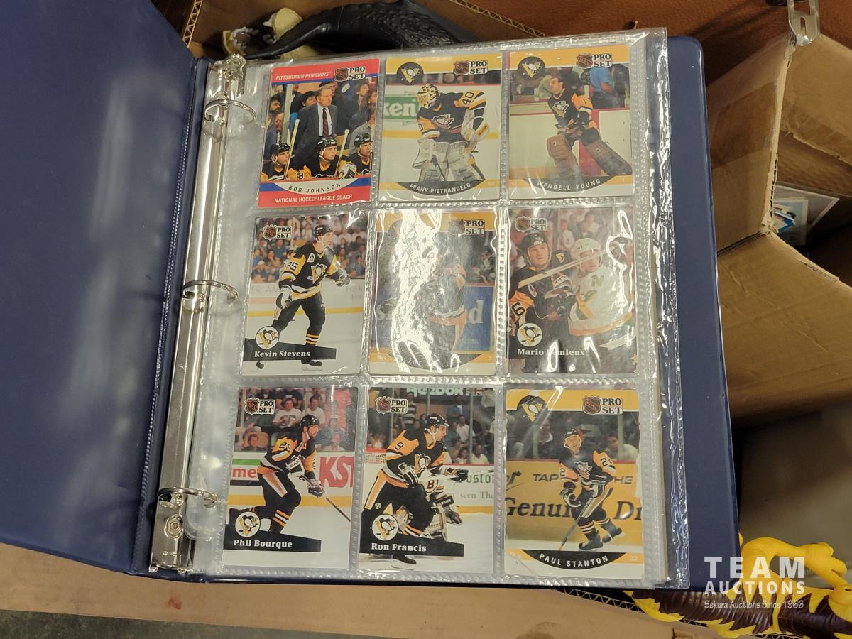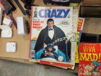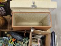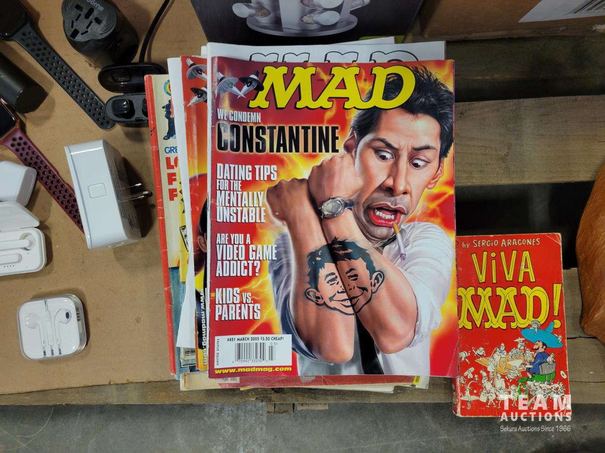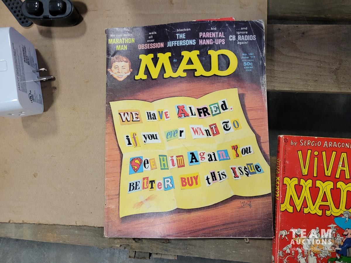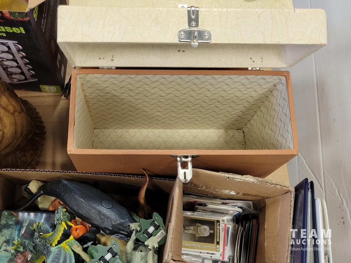 (2) record cases, Murano vase, electronics, baseball and hockey cards, toys, vintage Mad magazines