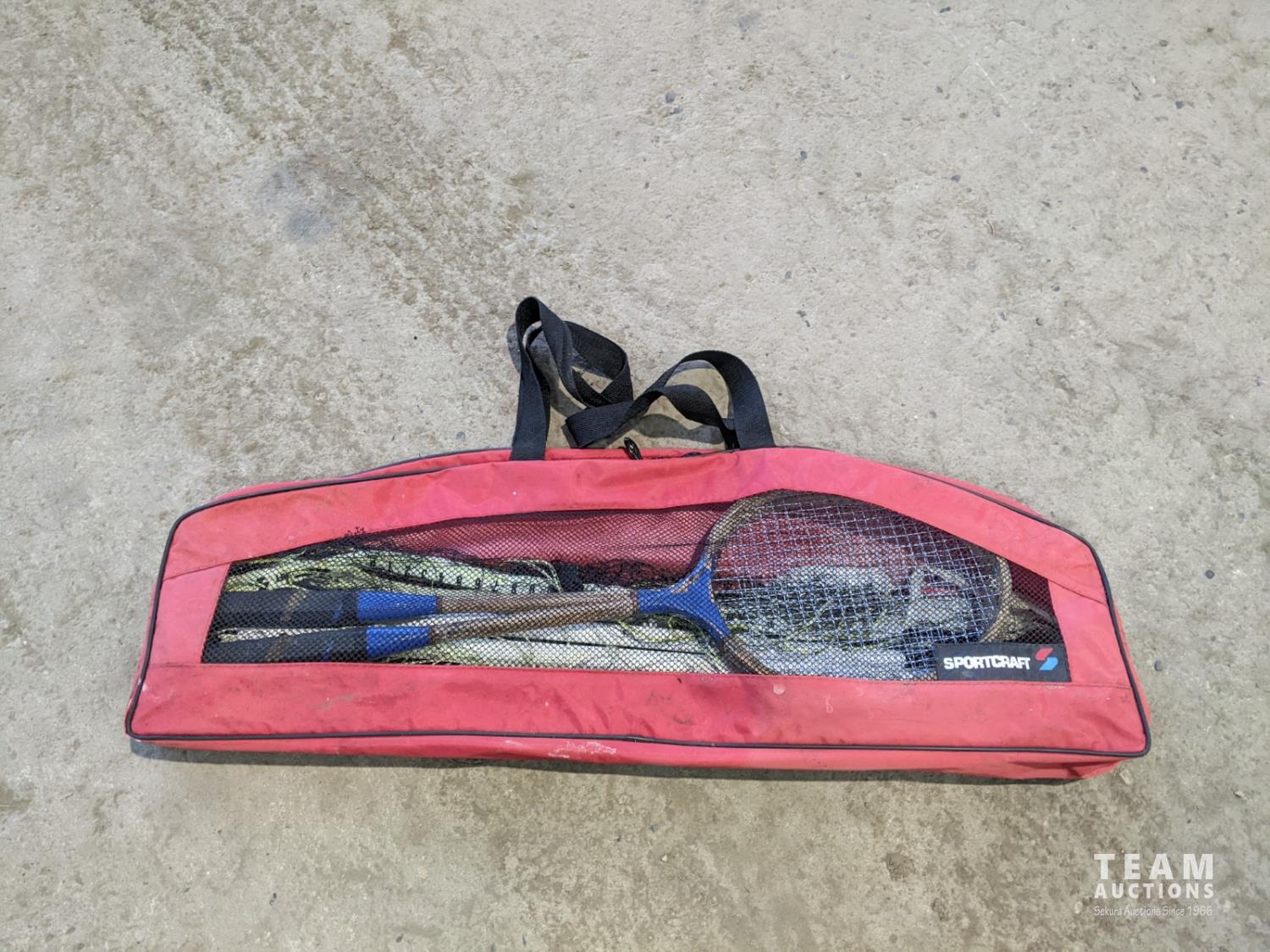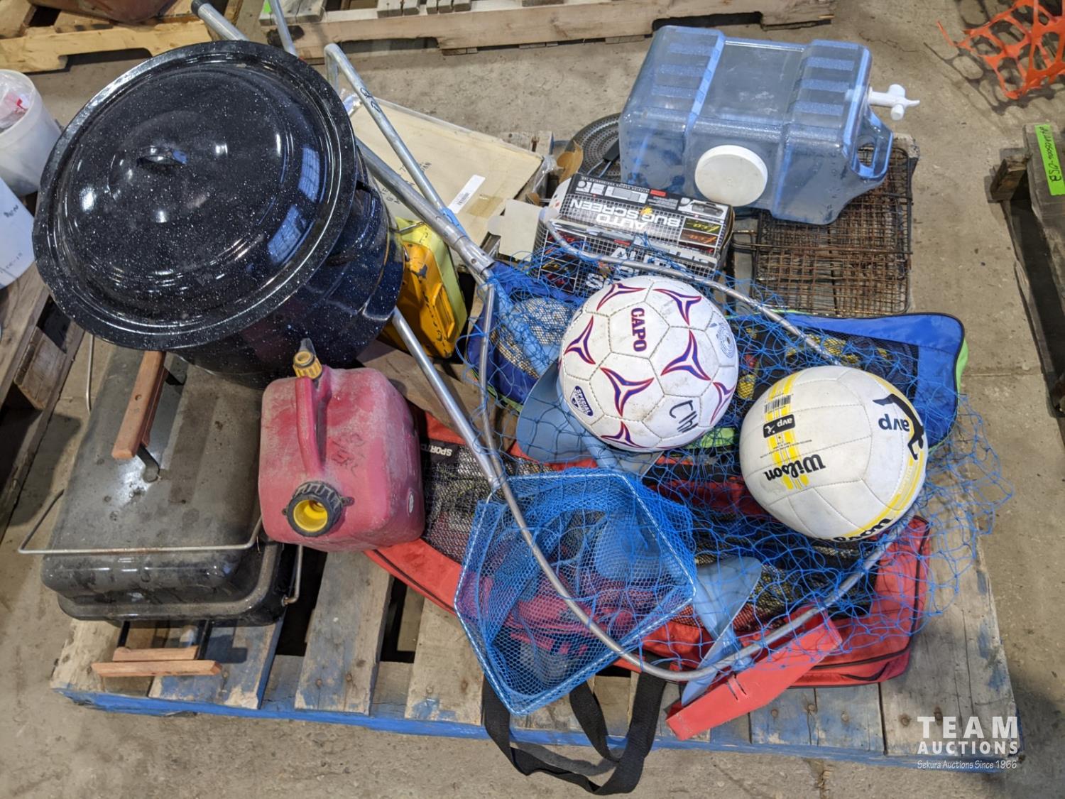 fishing net, portable Weber BBQ, badminton, sport balls, horseshoes lawn game, folding grill, jerry can, ice auger