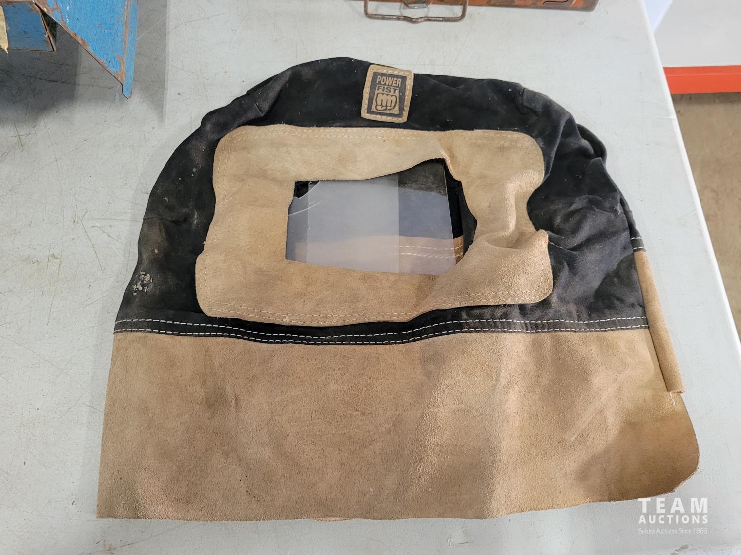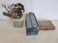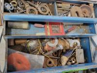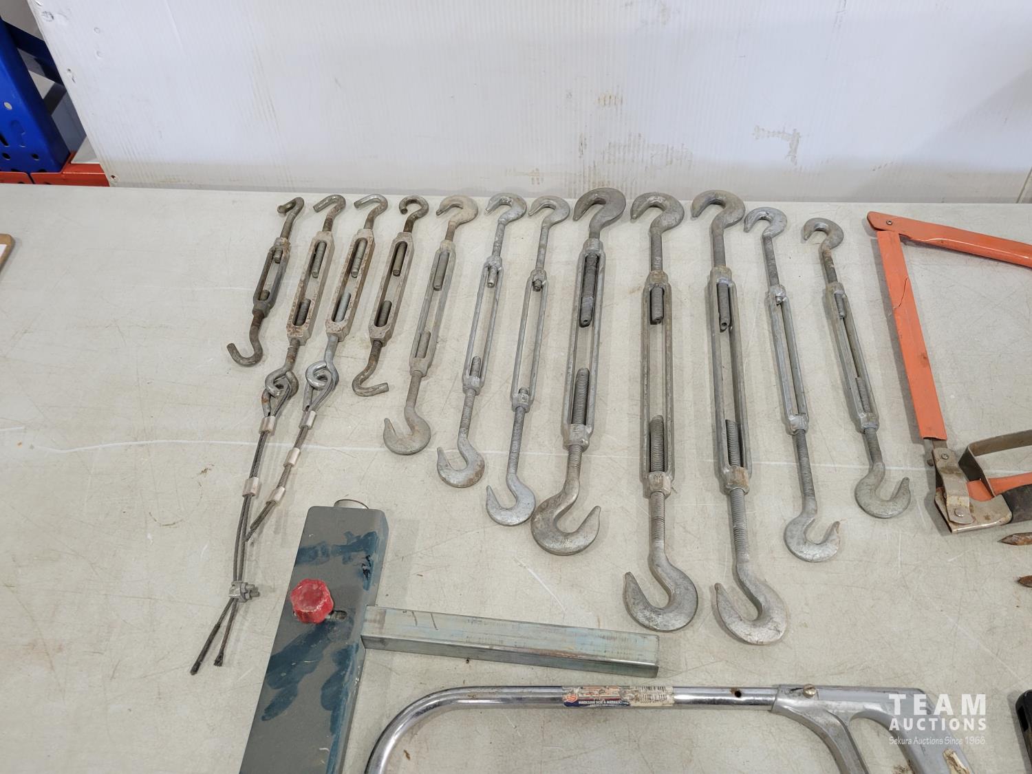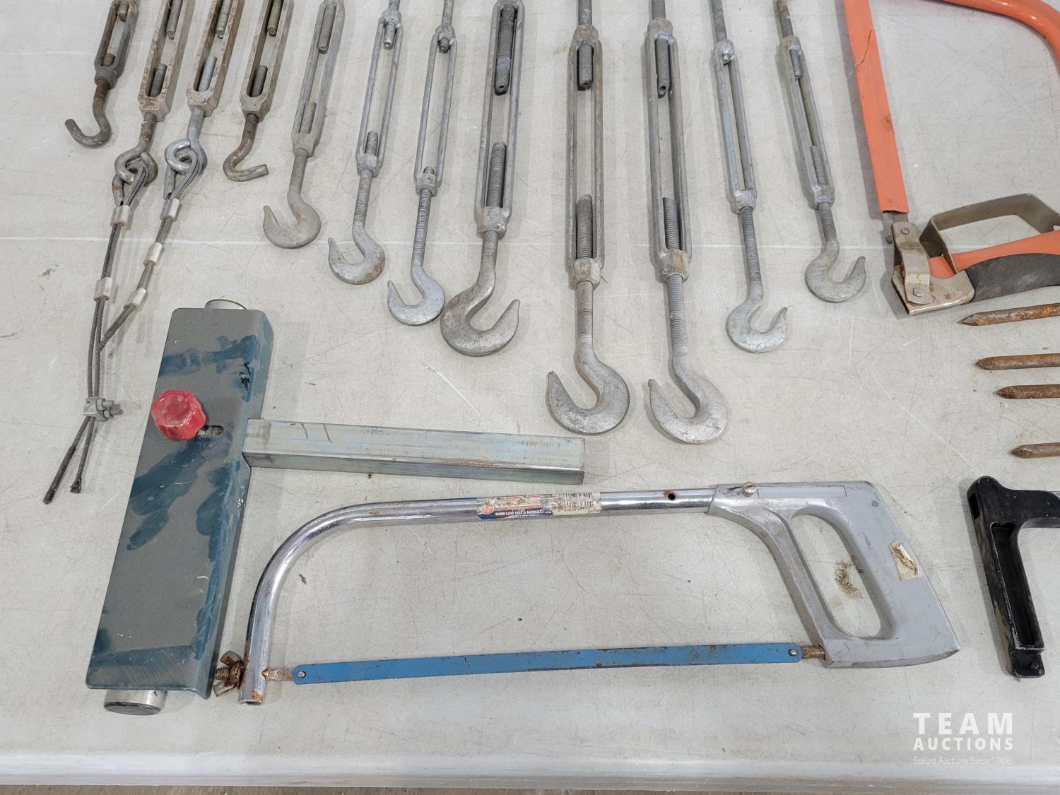 (12) hook turnbuckles, (3) hack saws, (1) toolbox with contents, parts organizer, sandblasting helmet