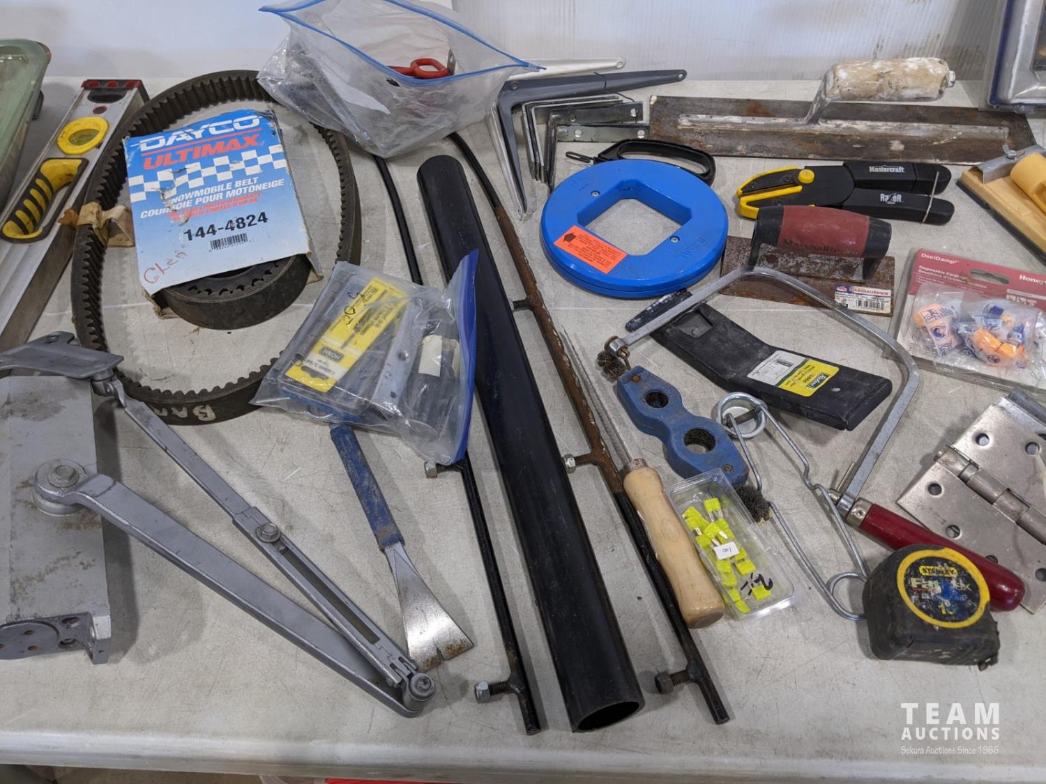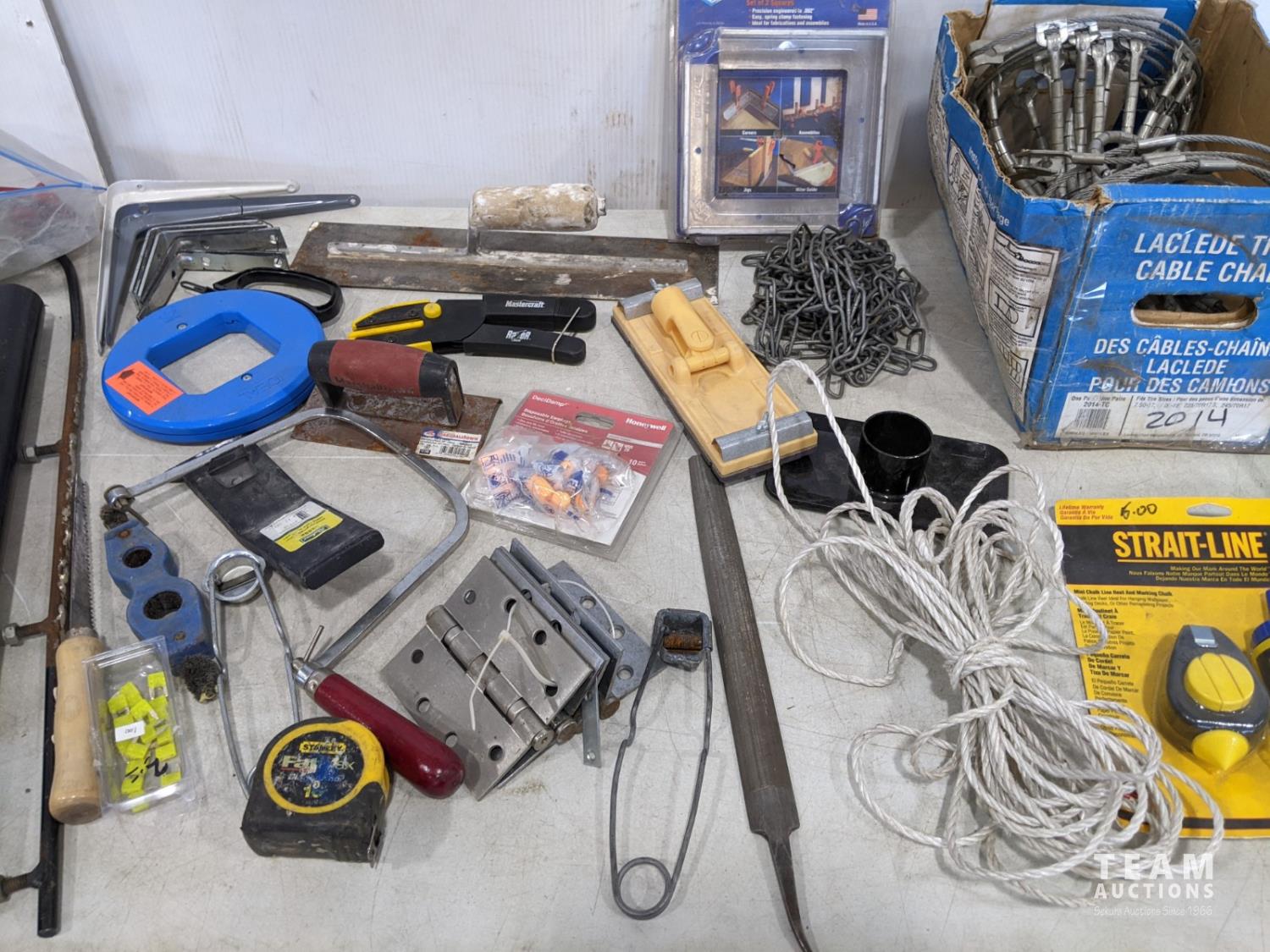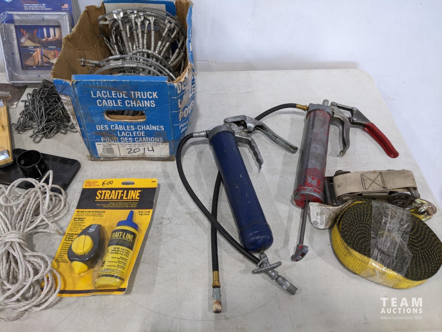 brackets, (2) grease guns, heavy door hinges, trowels, cable chains