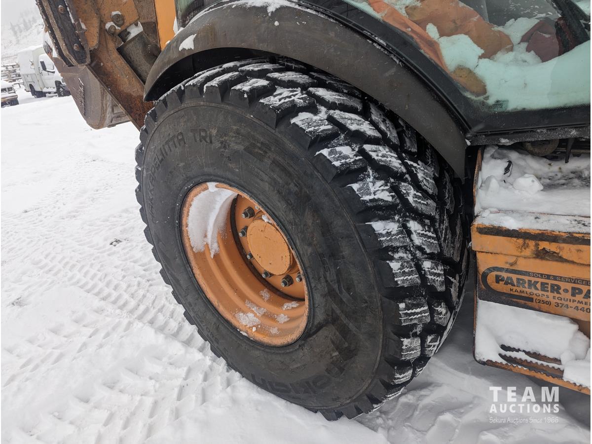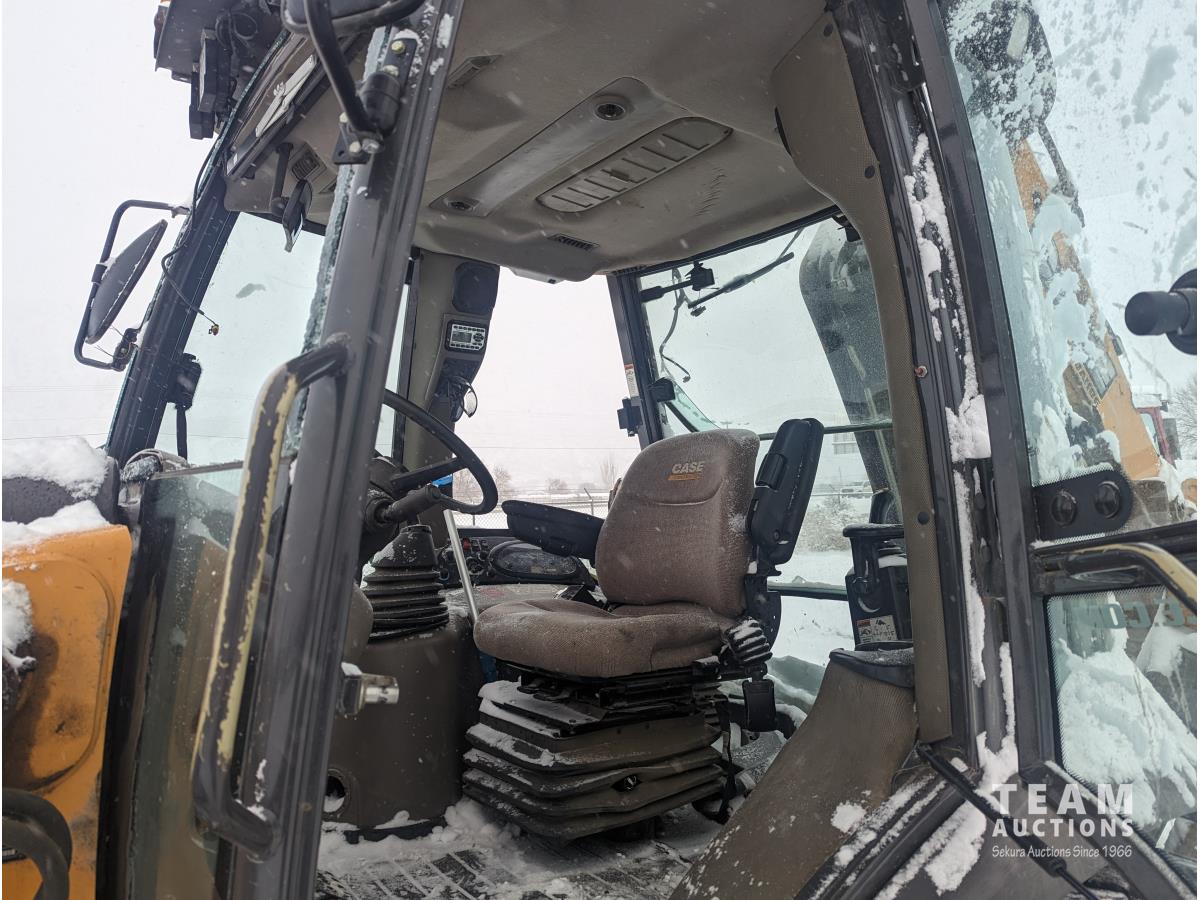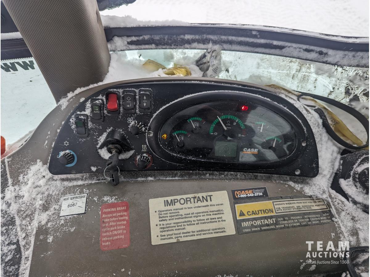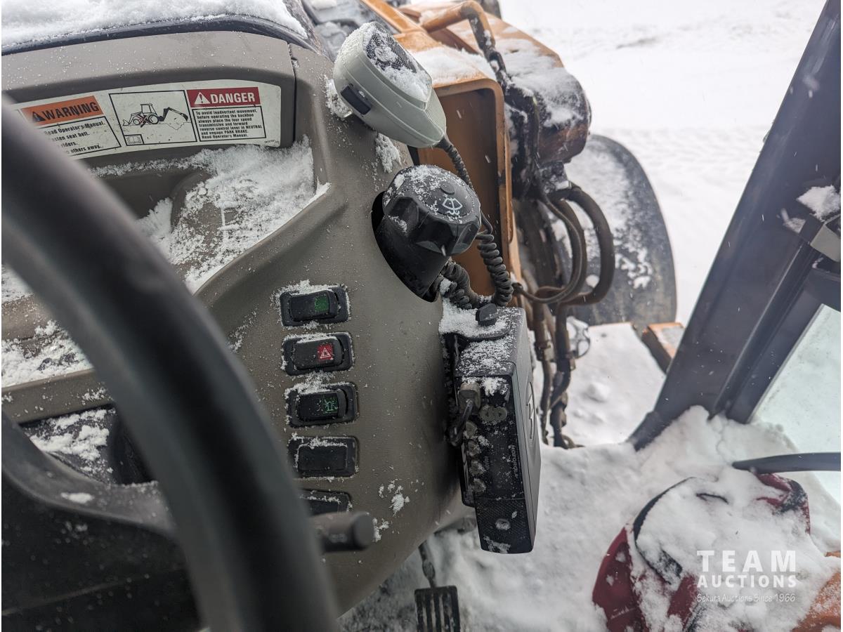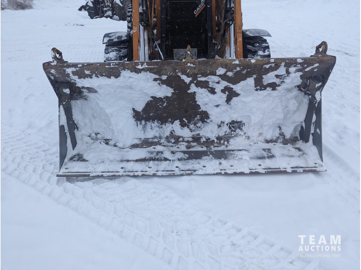 Case 4 cylinder diesel engine, 4 speed transmission, 92 inch multi purpose bucket, extended-a-hoe c/w 23 inch cleanup bucket, enclosed cab, AC, heat, CB radio, radio, 14.1-17.5 fronts, 540/70R24 rears