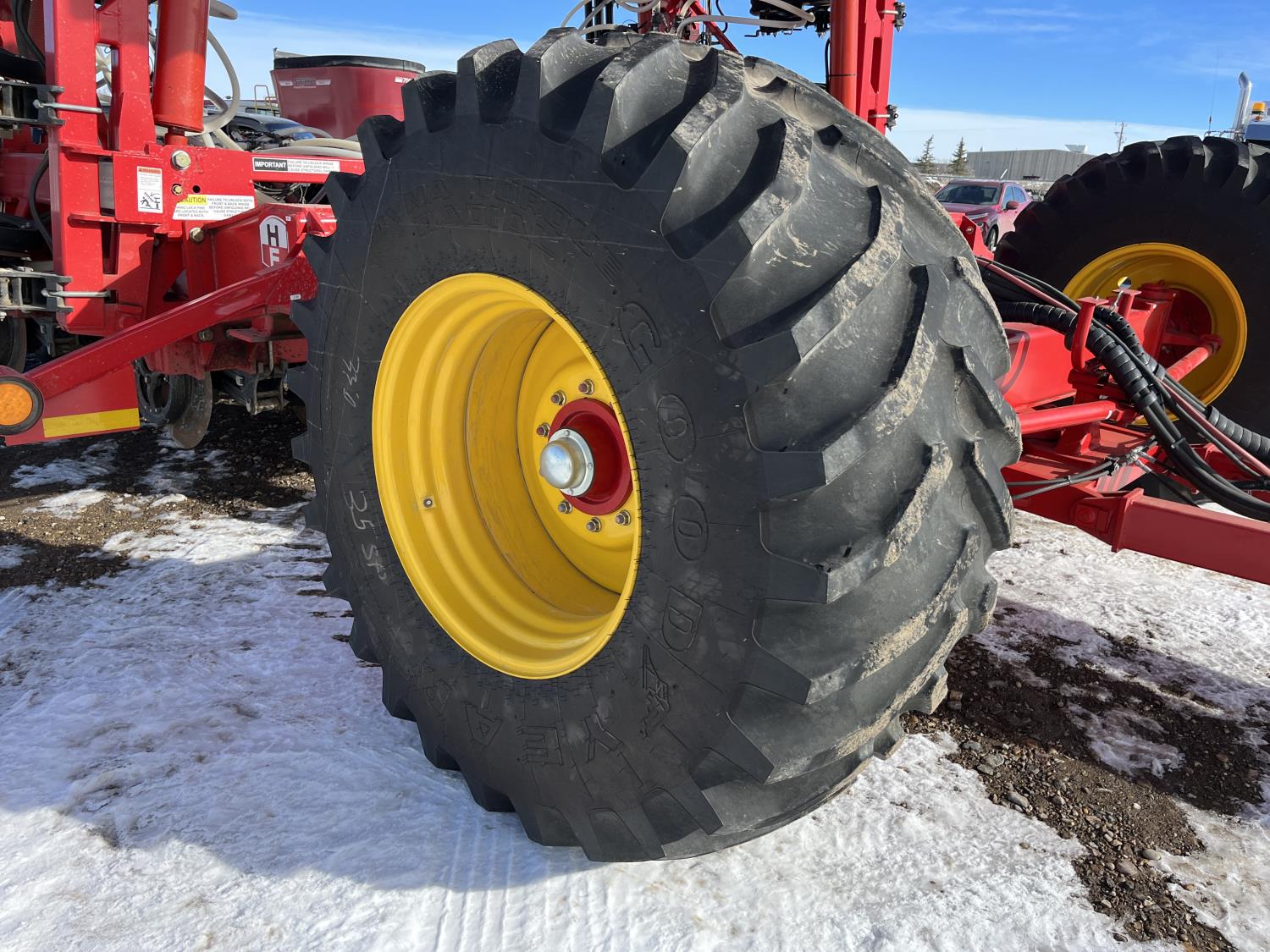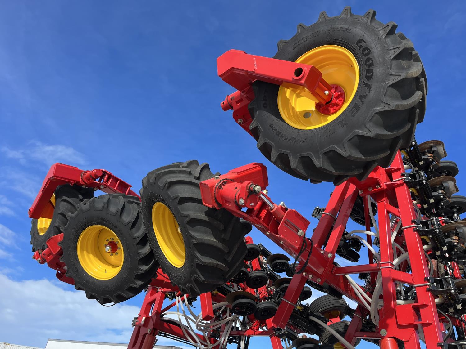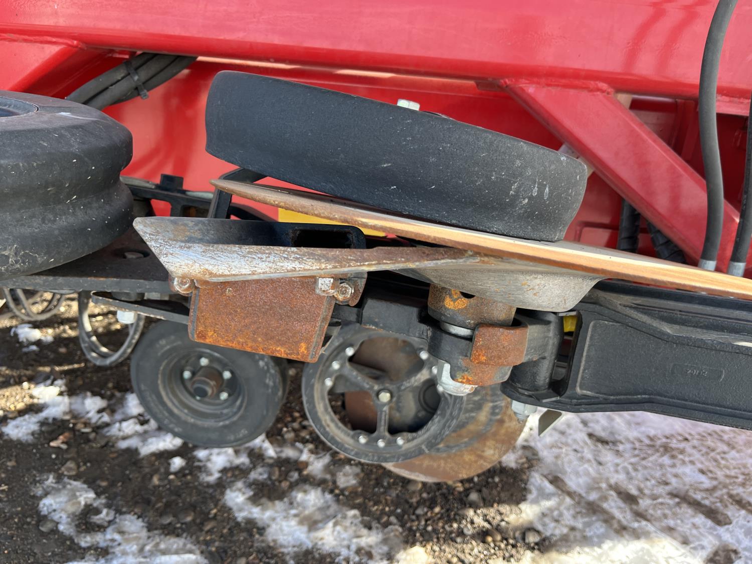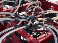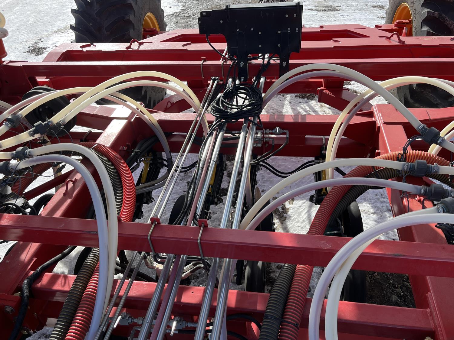 12 inch spacing, double shoot openers, 4.5 inch rubber packers, blockage sensors, Drill control monitors, Novlan Bros disc wing scrapers, 800/65R32 front tires, 16.5L-16.1FI rear tires, 540/65R24 wing tires, Ipad with blockage sensor software included, was paired with tow behind New Holland P4760 Air Cart, 9000 acres seeded