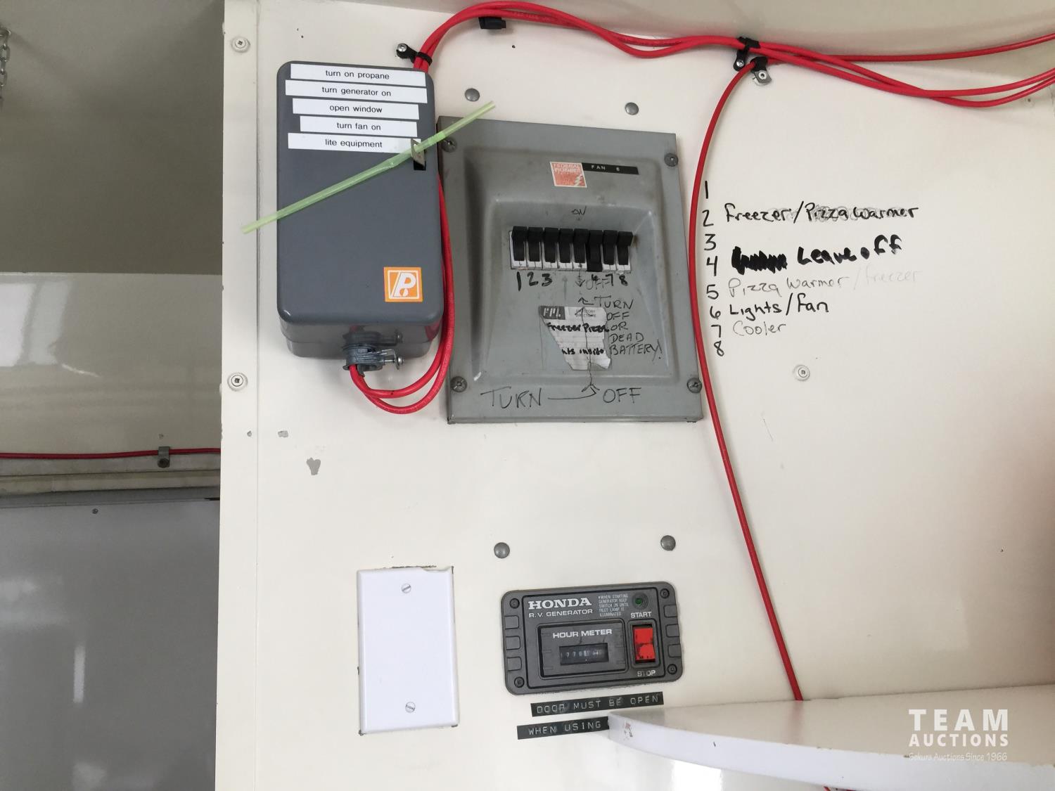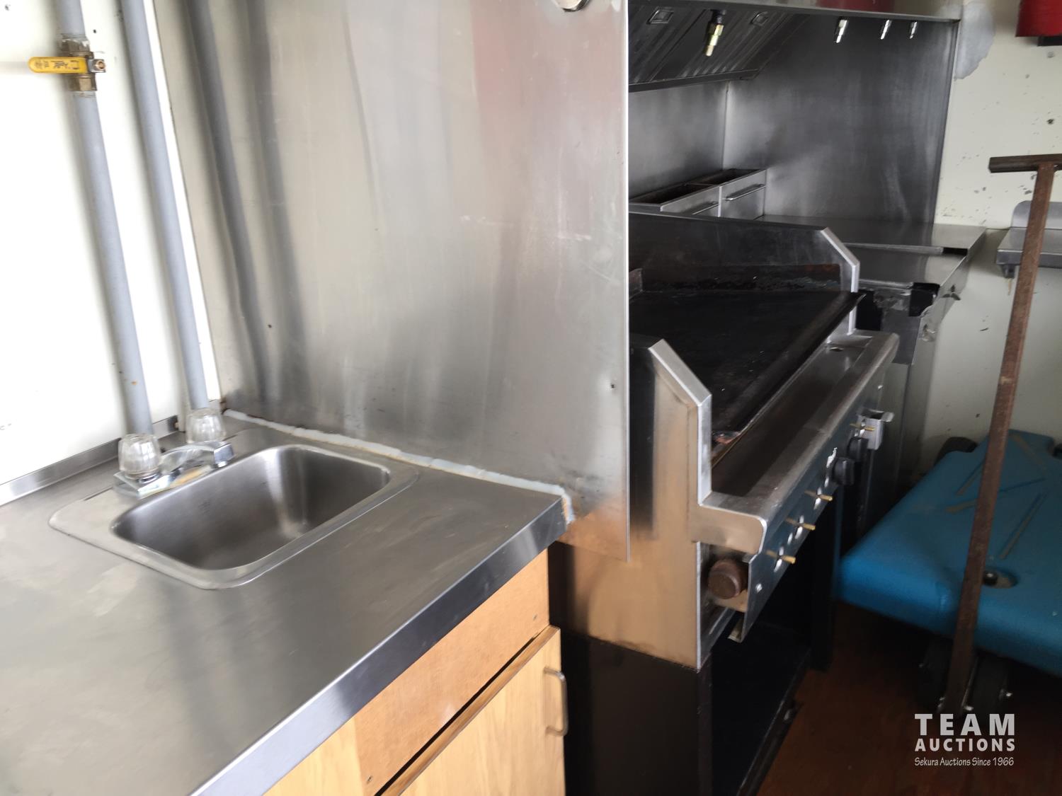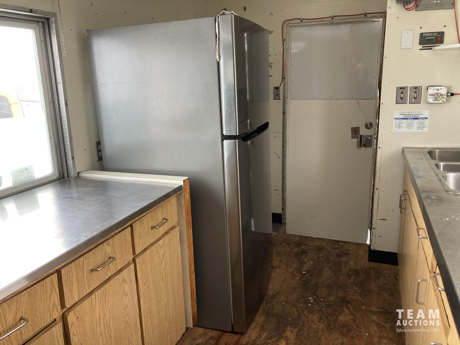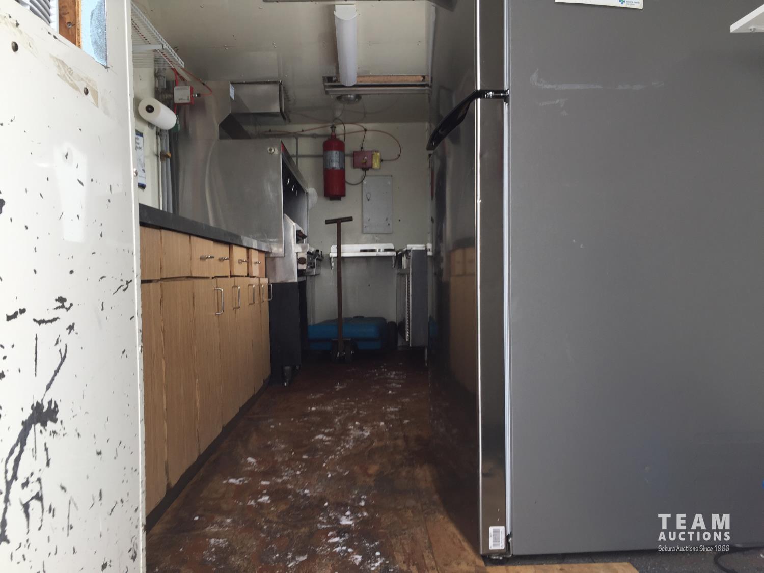 Ford 7.5 L V8 gas engine, 3 speed automatic transmission, radio, 8 ft x 19 ft deck, 19 ft van, 1990 ITB rig up, Honda EV6010 Generator, Pyro-Chem Fire Suppression System, Stainless Steel Work Surfaces, LG Fridge, Quest 2 vat Fryer, Quest Gas Stove, spring suspension, 204 inch WB, 215/85R16 tires