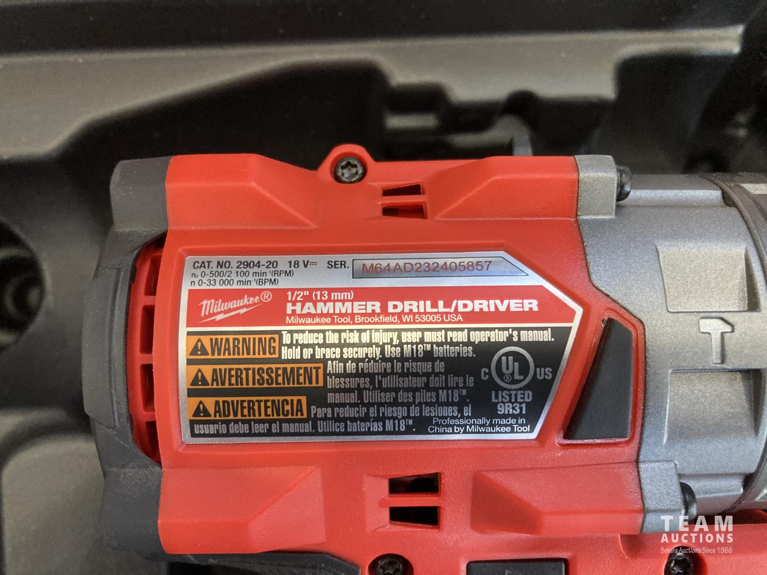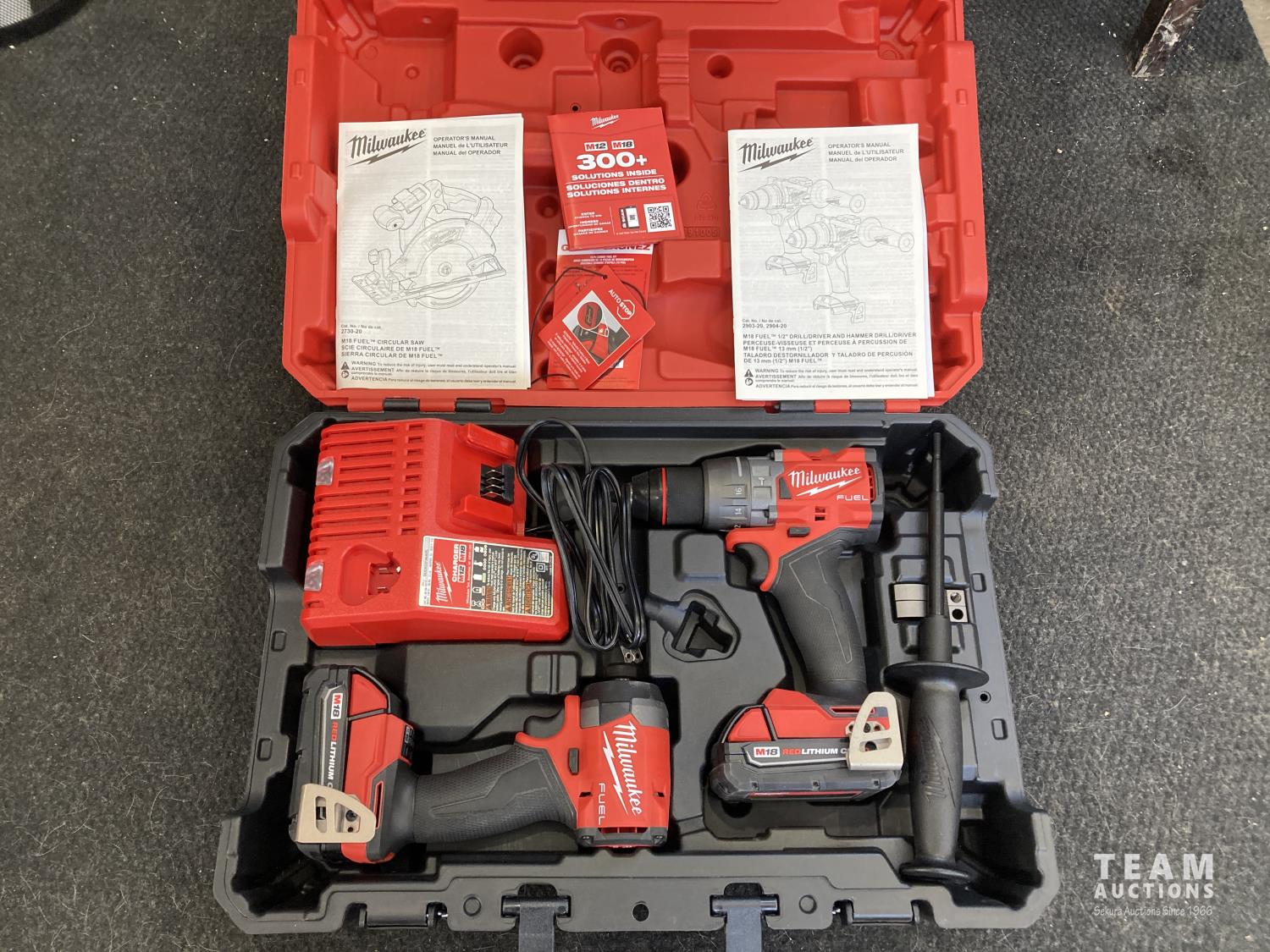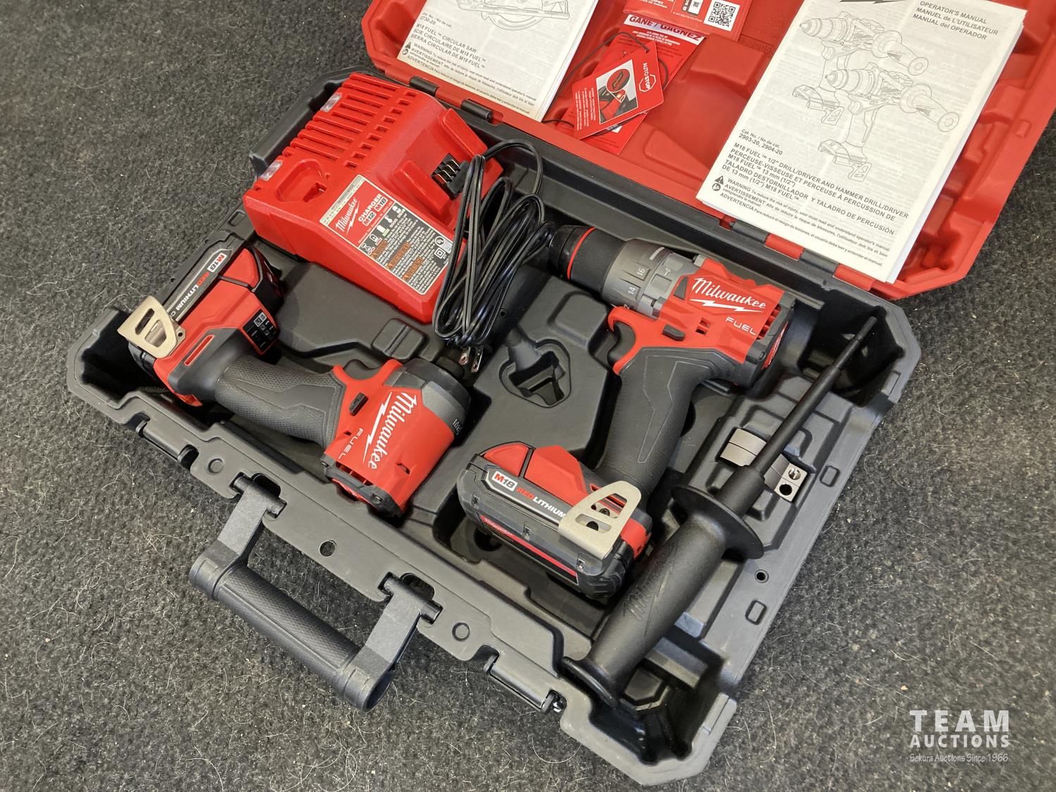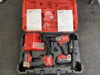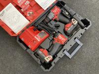 1/4 inch impact driver, 1/2 inch hammer drill/driver, (2) M18 batteries & charger
