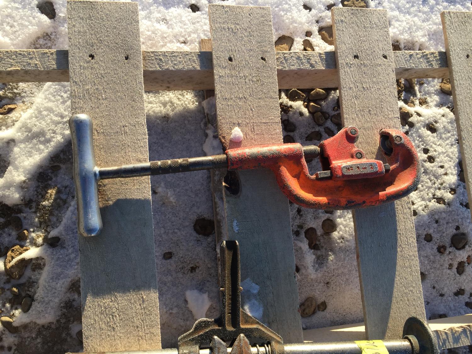 24 inch timber tongs, 18 Ridgid pipe cutter, Volkswagon jack