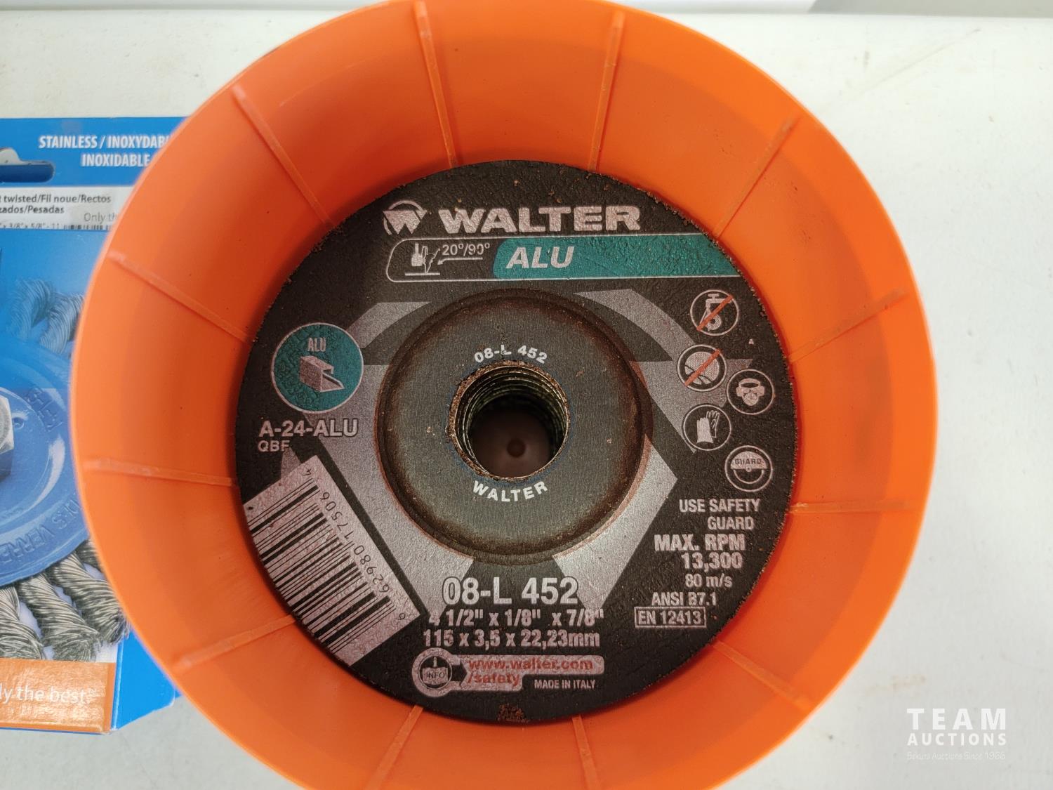 5066 (15) Walter 4-1/2 Inch X 1/8 Inch X 7/8 Inch Aluminum Grinding Discs and (2) 4-1/2 Inch Wire Wheel Brushes (Unused)