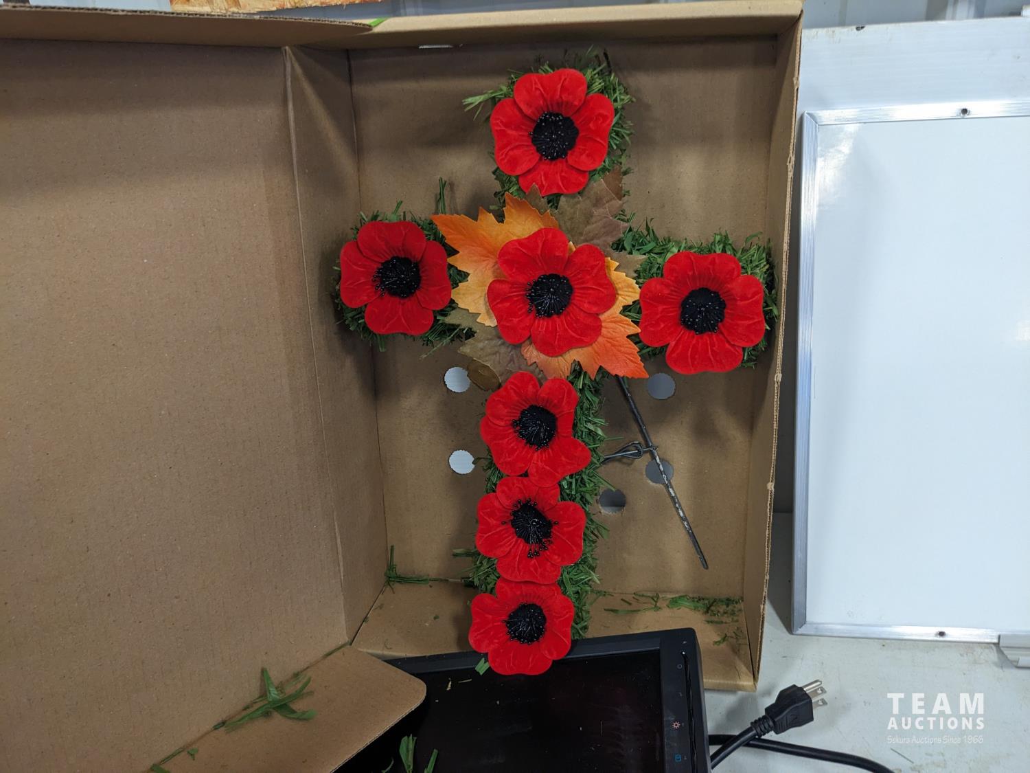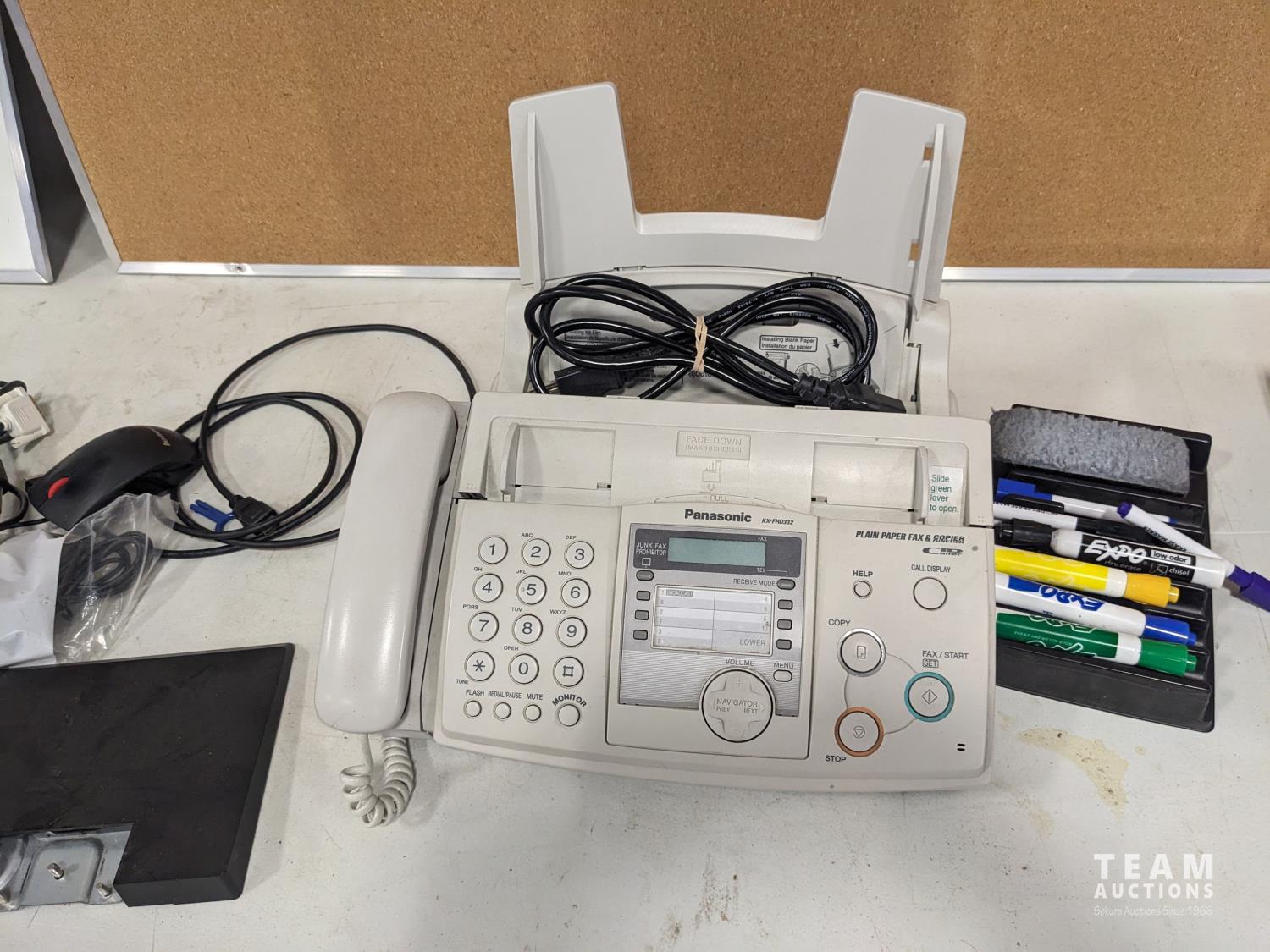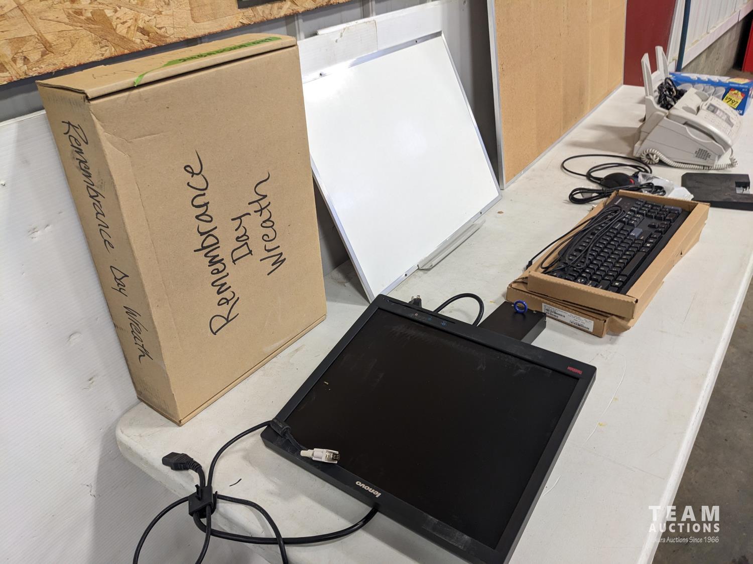 fax machine, cork board, Eraser board, (2) key boards, small monitor, light bulbs, miscellaneous computer cords, remembrance day wreath
