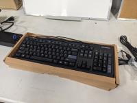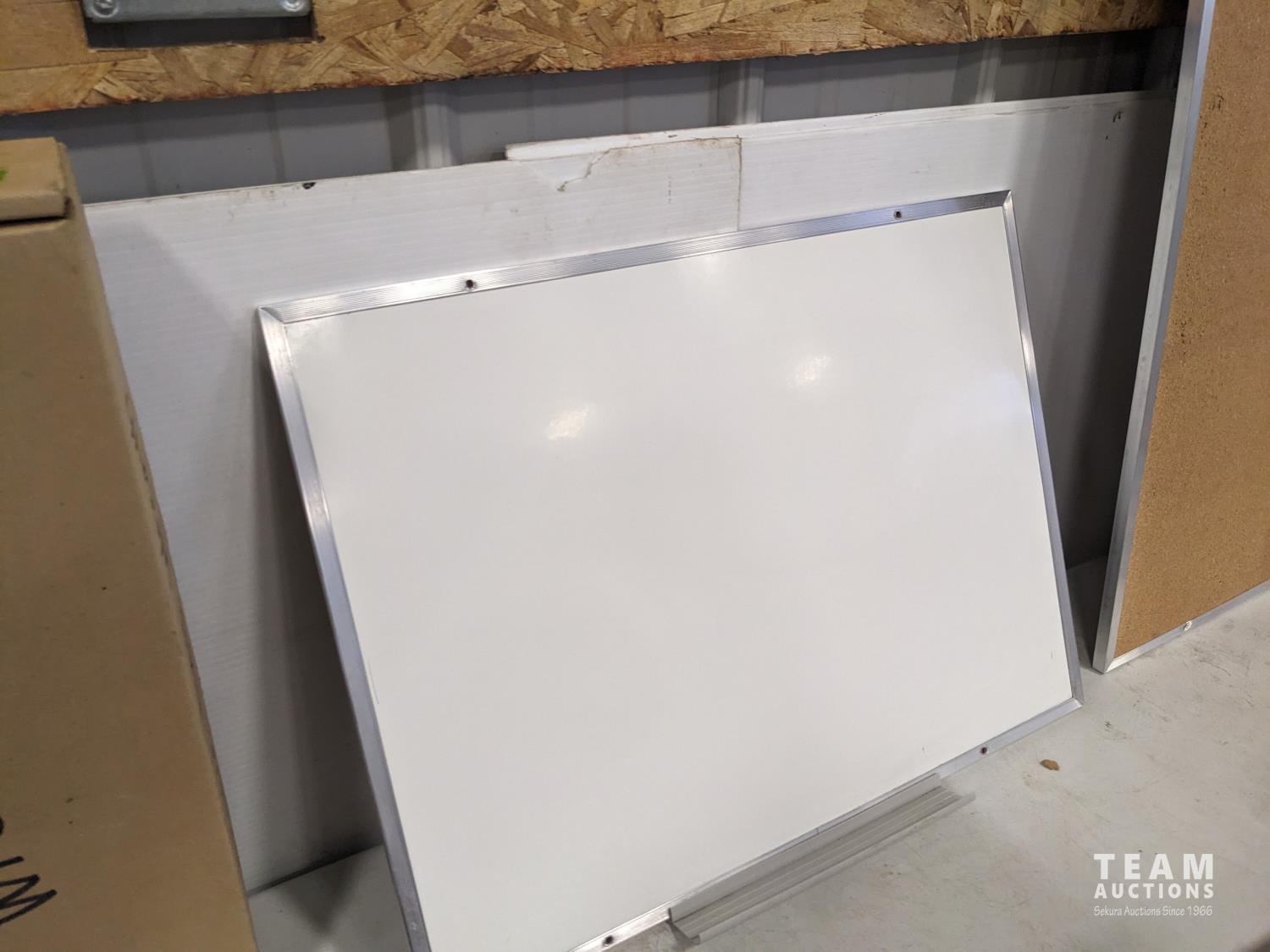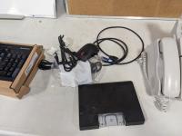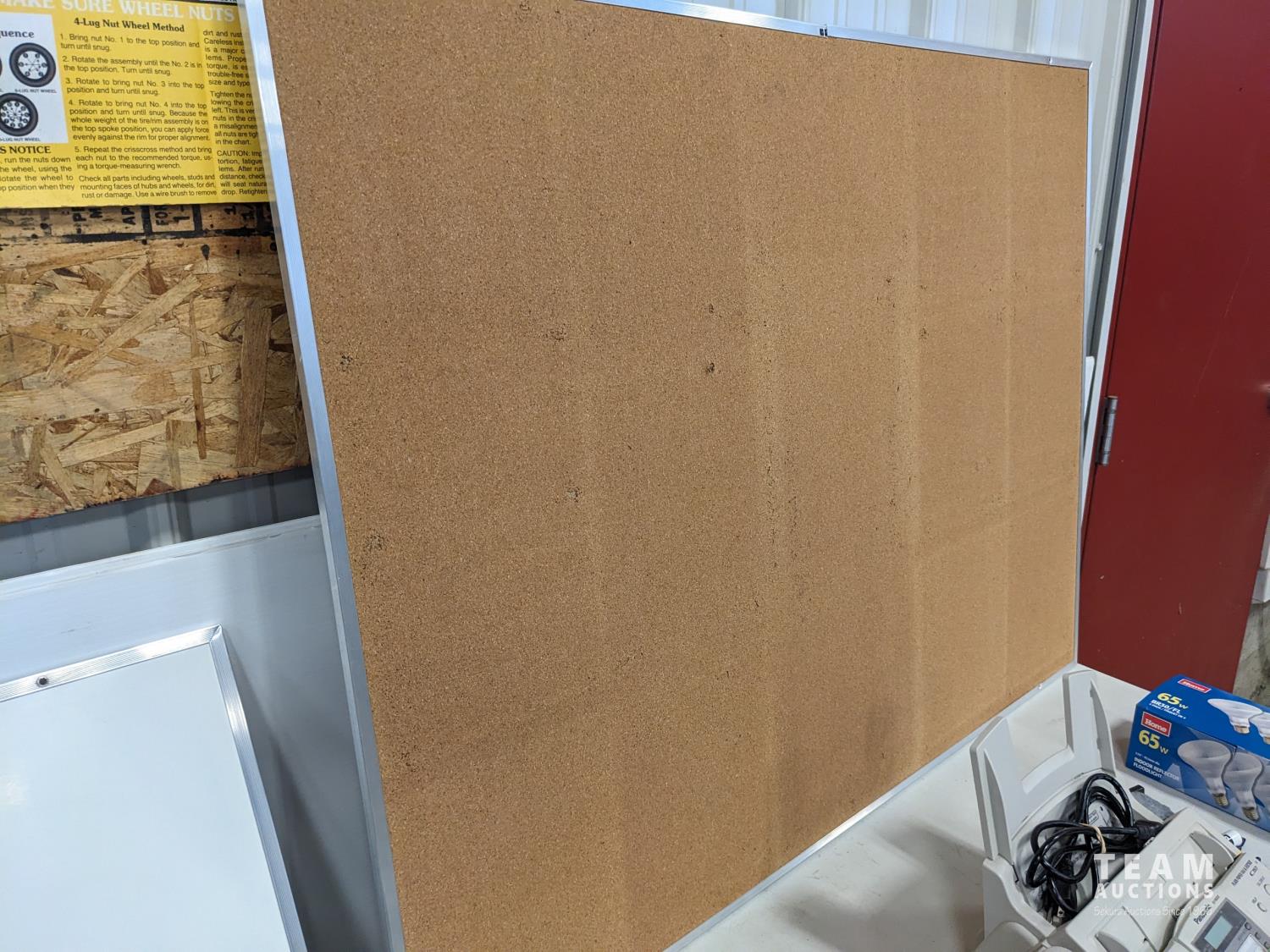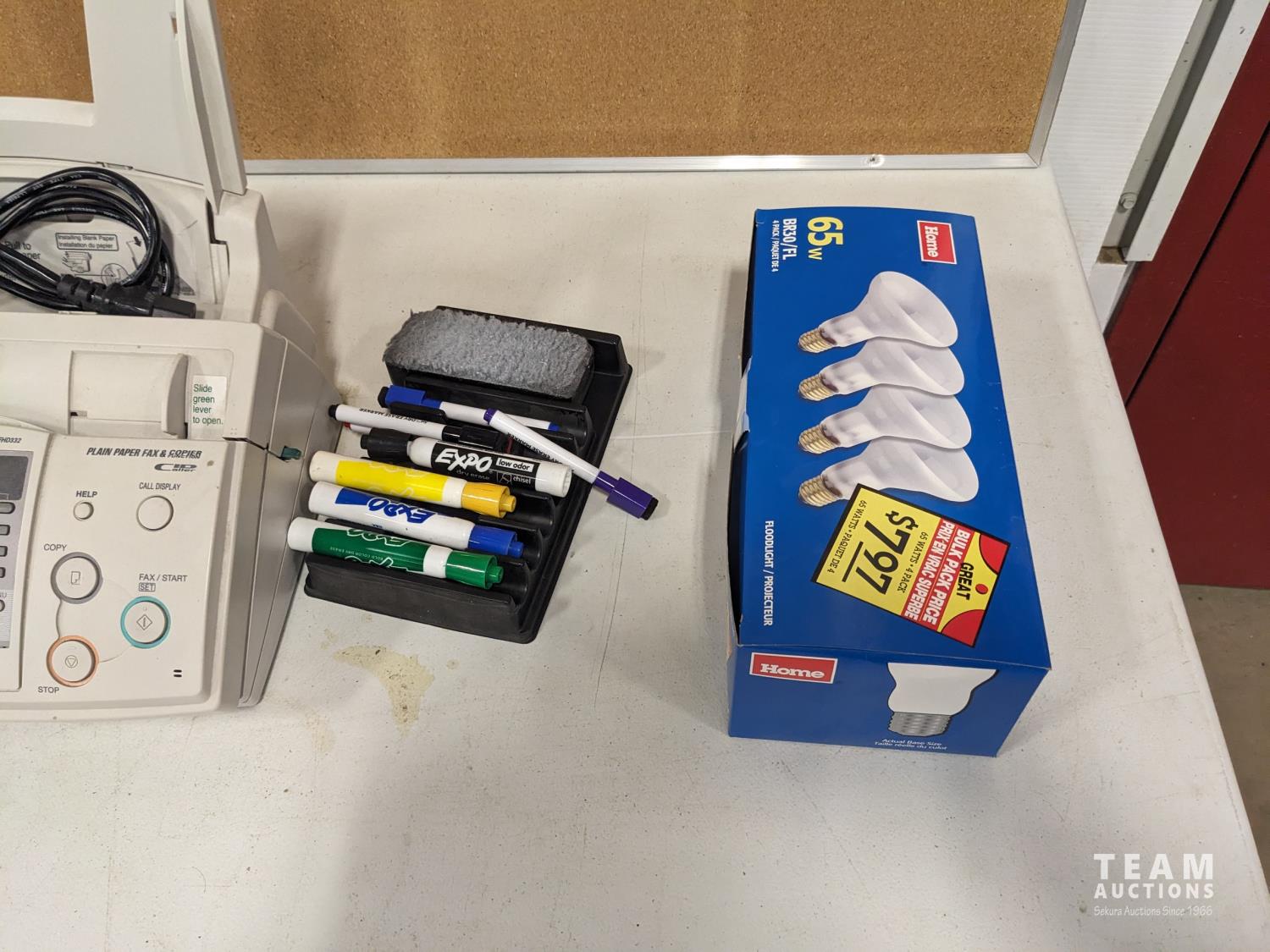 fax machine, cork board, Eraser board, (2) key boards, small monitor, light bulbs, miscellaneous computer cords, remembrance day wreath