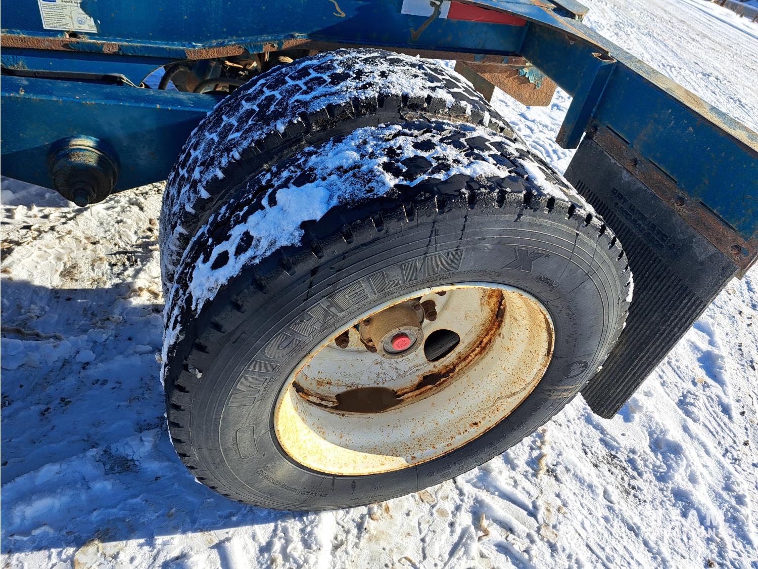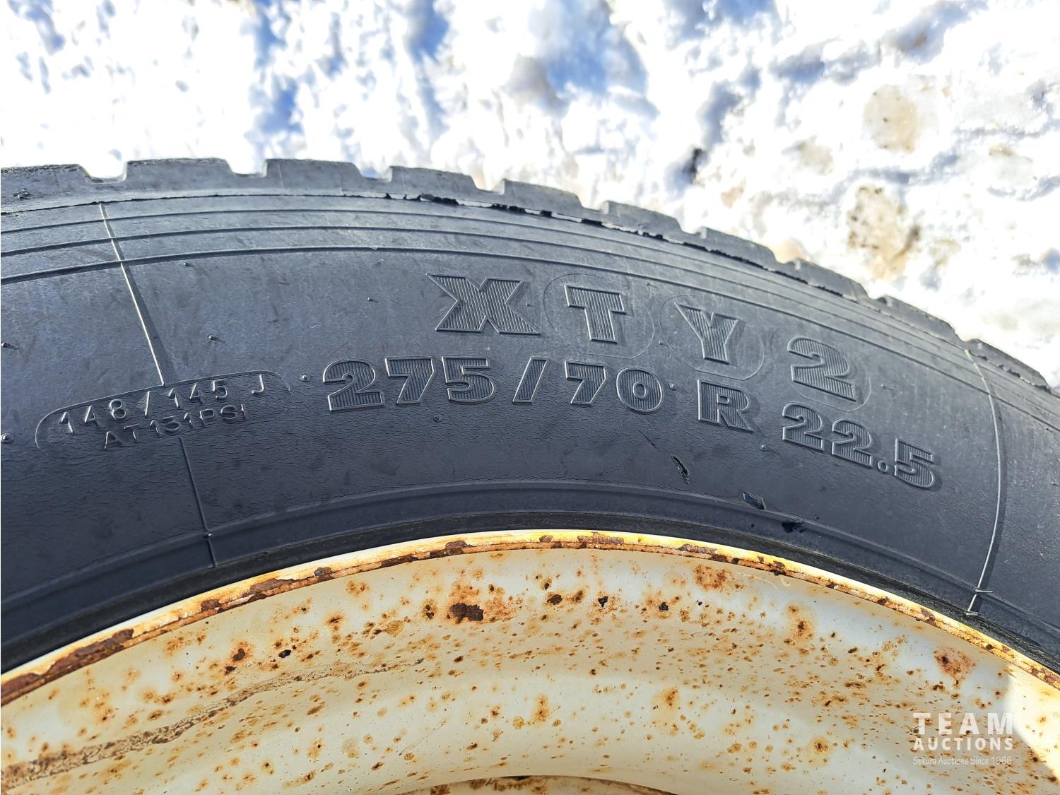 Air ride suspension with walking beam axle, dual front jacks, 275/70R 22.5 tires