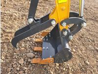 420cc (15hp) gas motor, electric start, 12 volt battery included, with optional pull start, battery disconnect, hour meter, controller lockout, joy sticks, hydraulic oil tank gauge, LED work light, 39" backfill blade, 15" bucket, ripper teeth, fixed thumb, auxiliary hydraulic outlets and controls, 7 inch wide x 48 inch long tracks, adjustable seat, 2ft 8inch stick, canopy