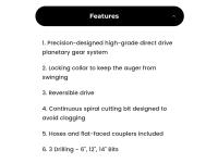 Requires hydraulic oil flow of 12 GPM to 16 GPM (± 1 GPM), 48 inch drilling depth, 80 inches overall length, universal mount, mounting plate height 20 inches, mounting plate width 48 inches, high-grade direct drive planetary gear system, locking collar to prevent auger from swinging, reversible drive, 6inch, 12 inch, and 14 inch bits, flat faced couplers, hoses