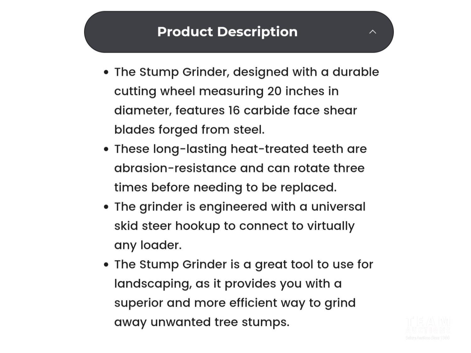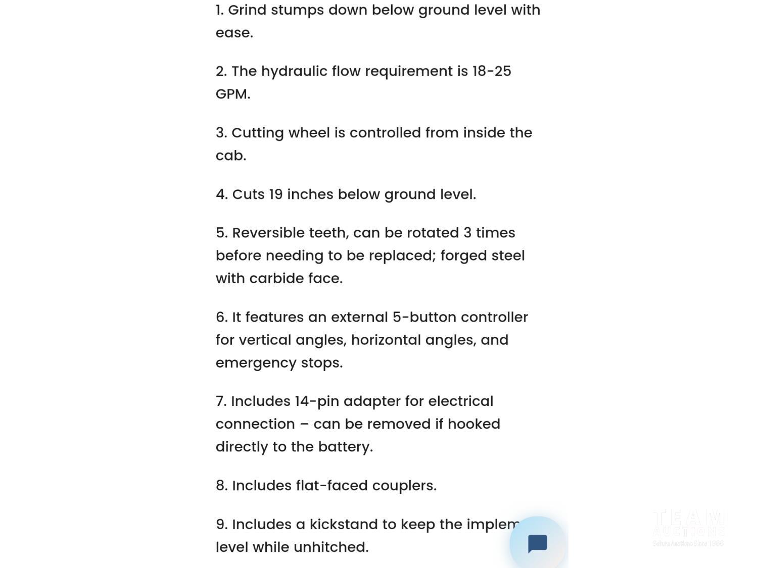 grinds up to 19 inch below ground, forged steel carbide teeth, 14-25 GPM, 2320-3000 PSI required