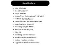 72 inch width, overall width 80 inches, 18 inch x 8.5 inch Polyurethane tires, 88 carbide tipped teeth, recommended hydraulic flow 15 to 33 GPM, 1100 lb, hydraulic power angling, wing kit, pistol grip control harness, loader specific wire harness, factory installed couplers