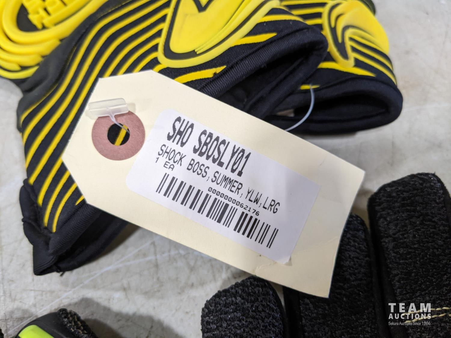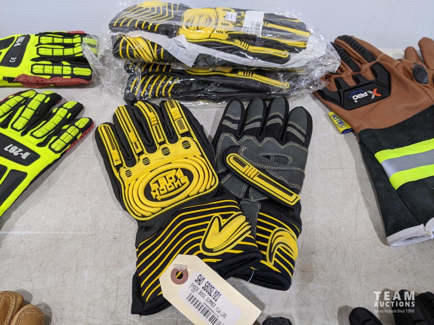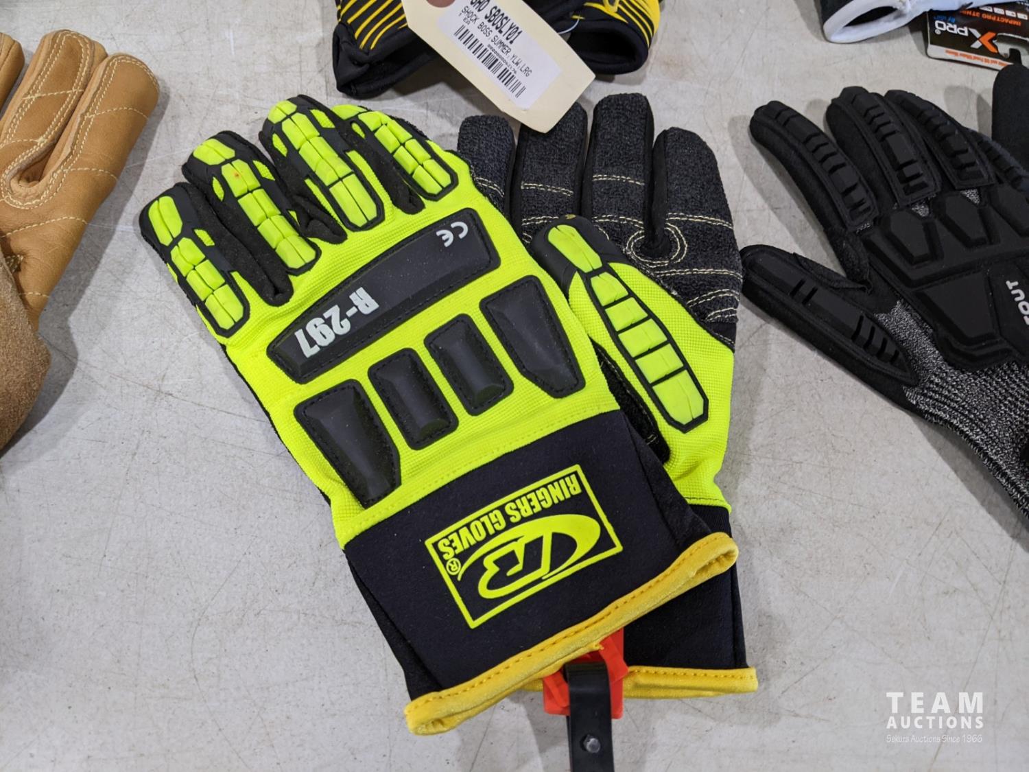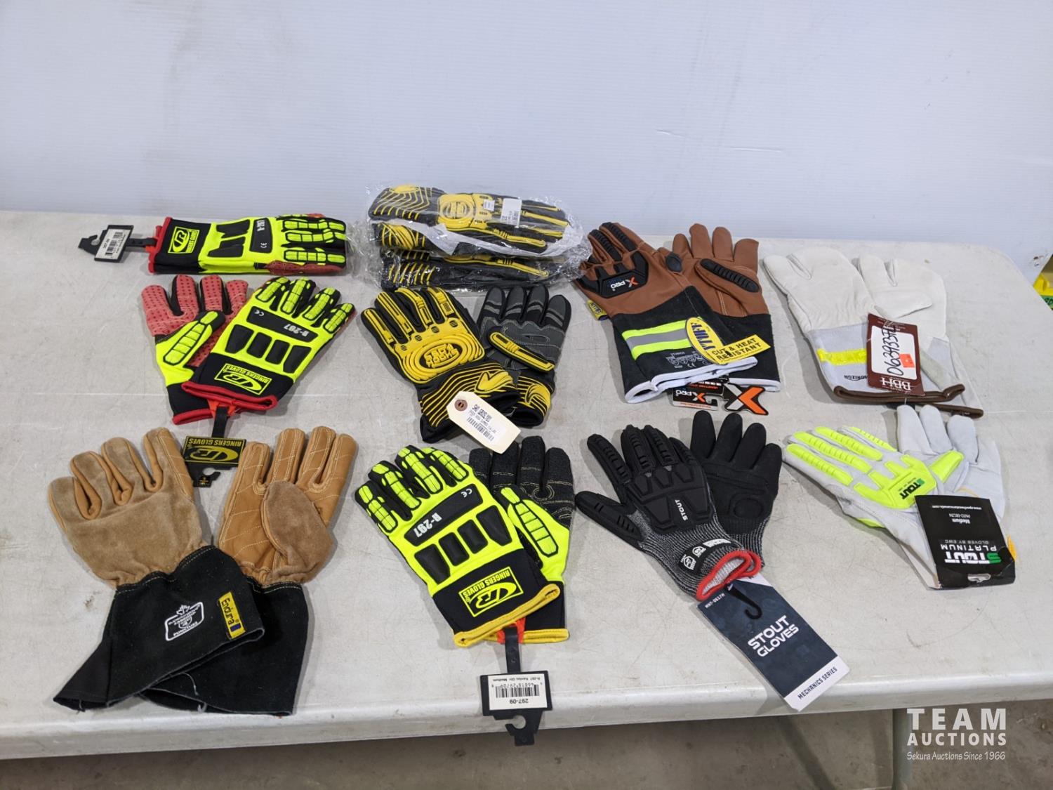 (3) Shock Boss summer yellow large, (2) Ringers medium, Endura welding gloves large, X-Pro welding gloves large, Ringers medium, Stout medium, Stout mechanics medium, Horizon mitts large