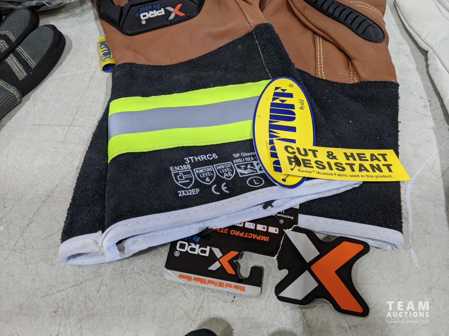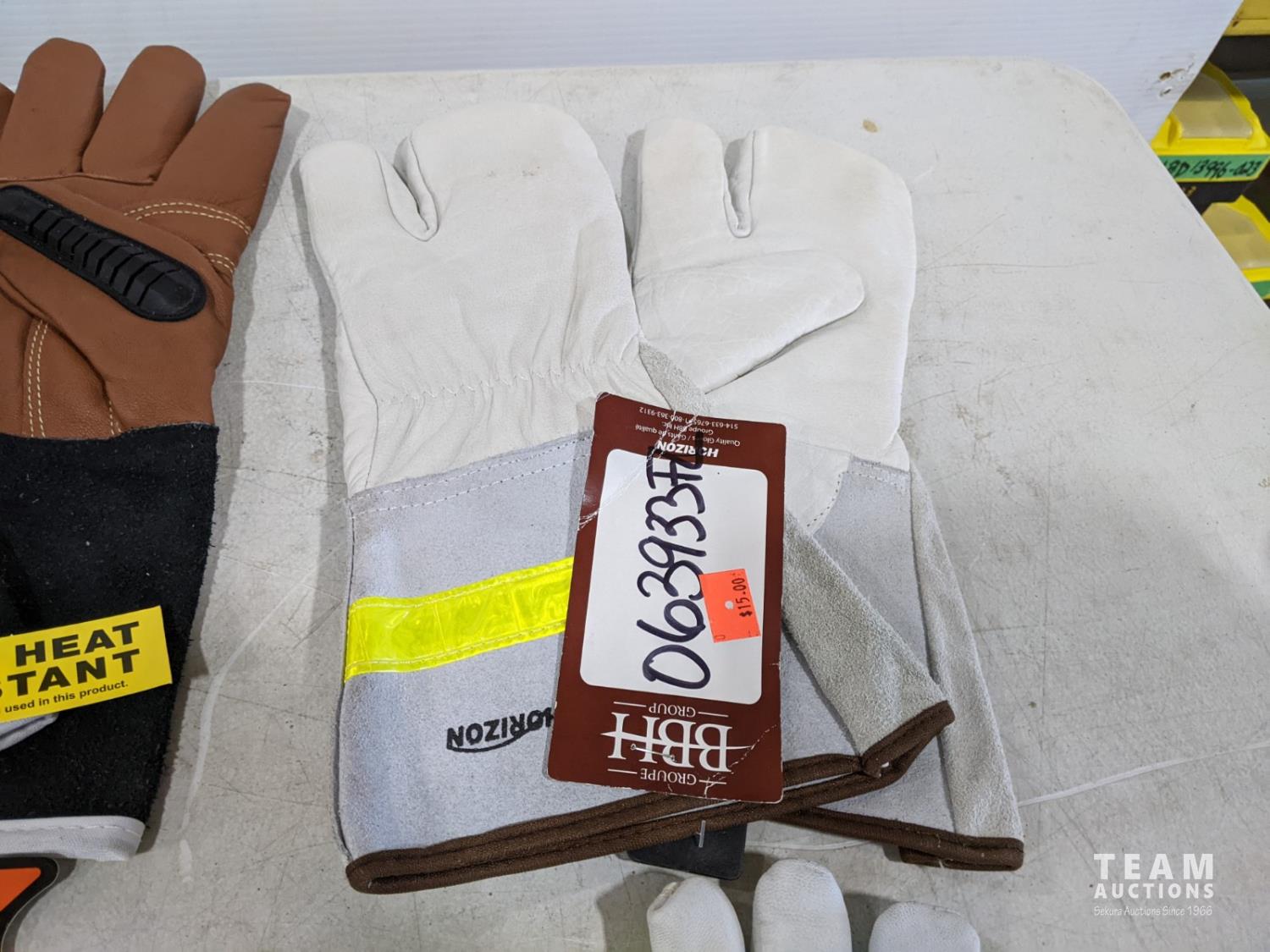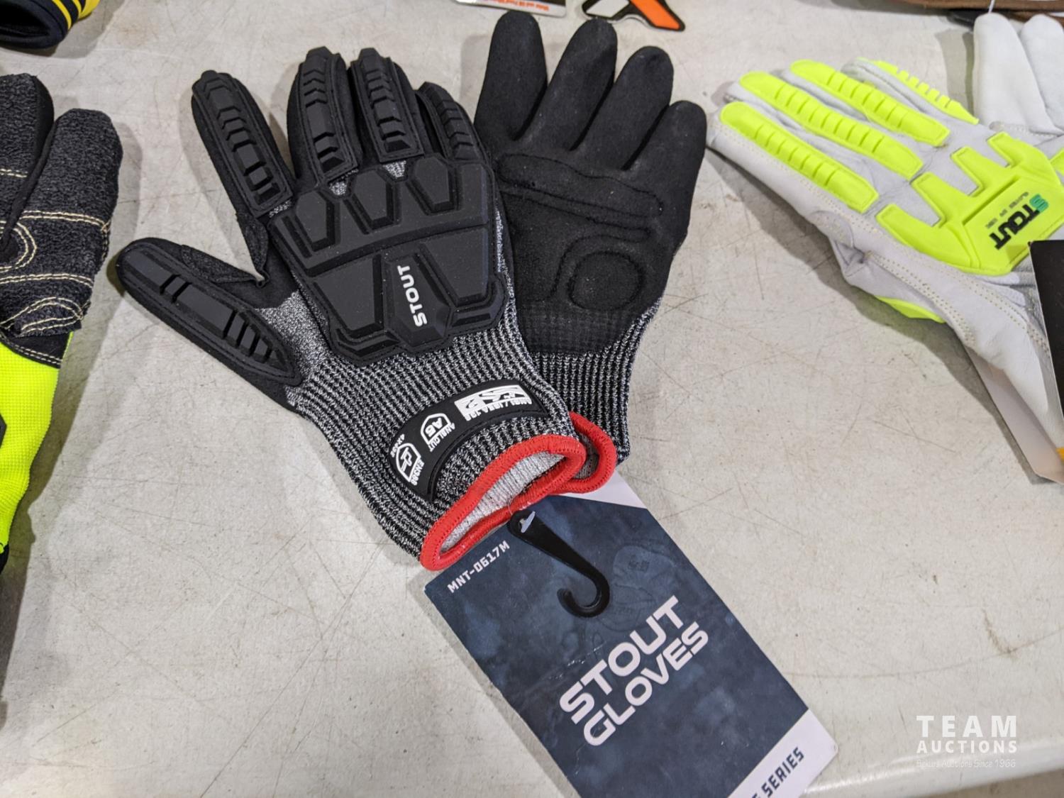 (3) Shock Boss summer yellow large, (2) Ringers medium, Endura welding gloves large, X-Pro welding gloves large, Ringers medium, Stout medium, Stout mechanics medium, Horizon mitts large