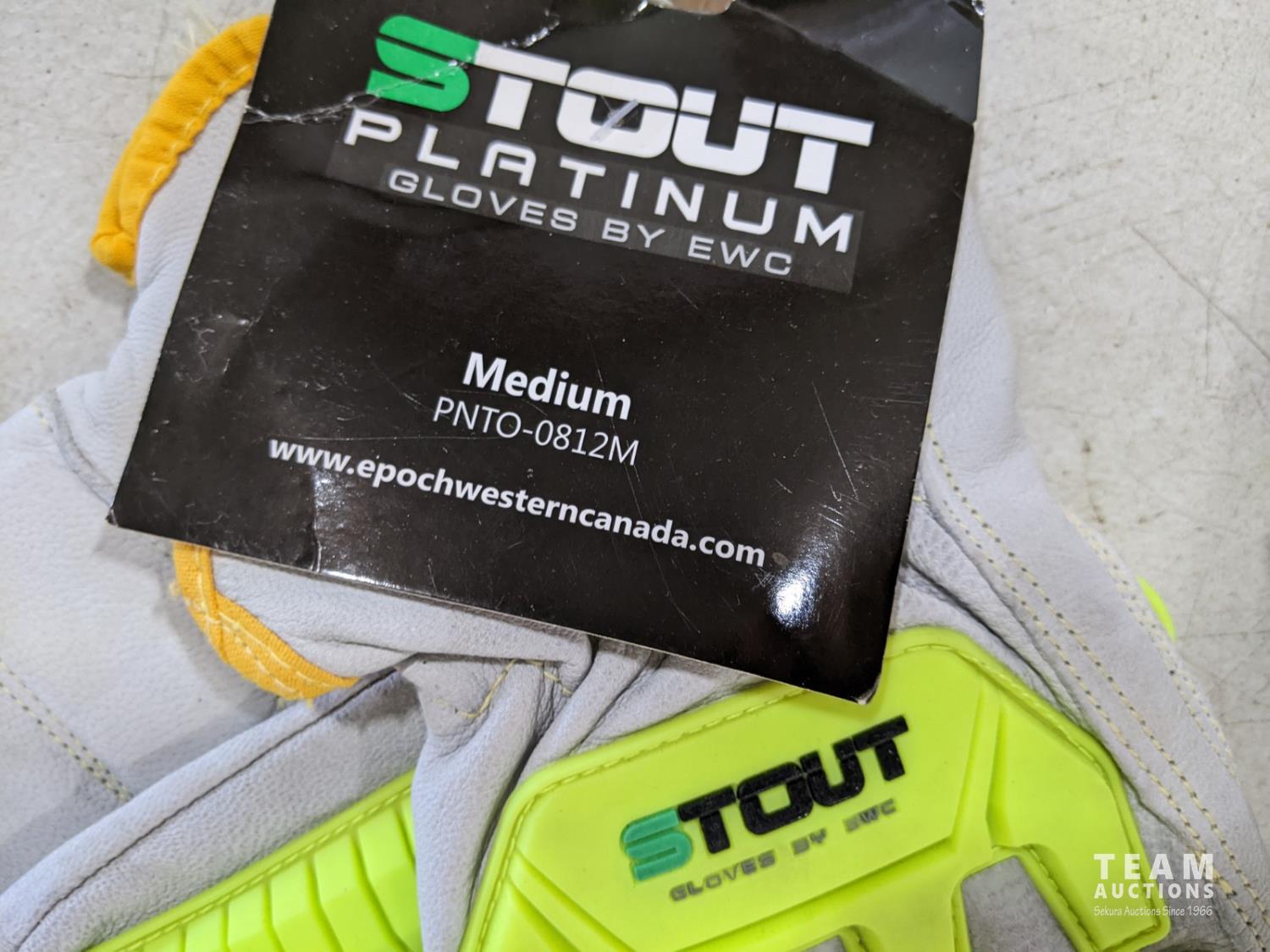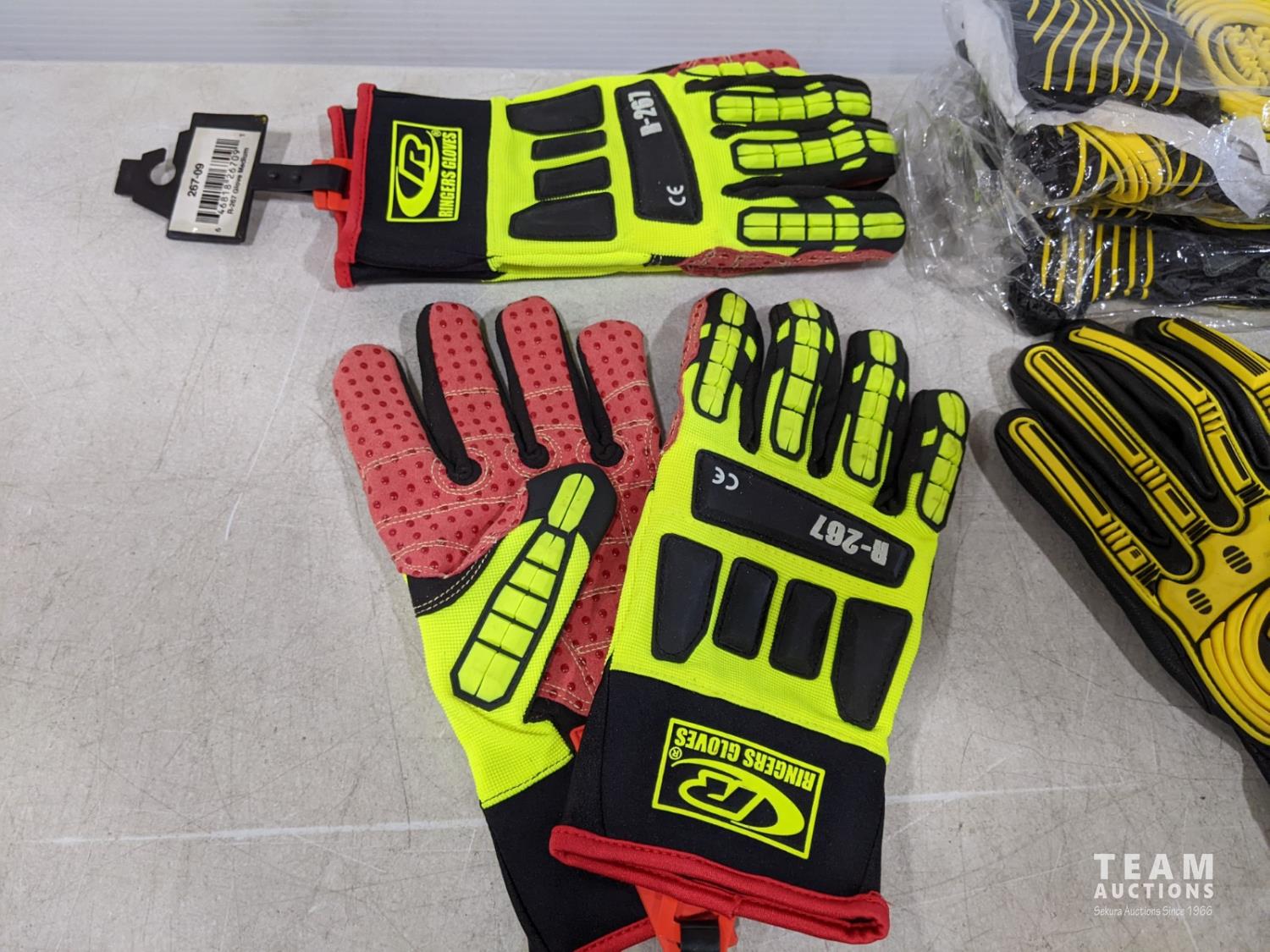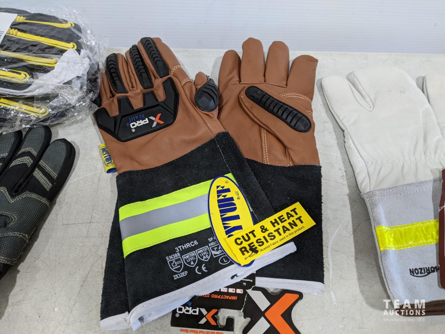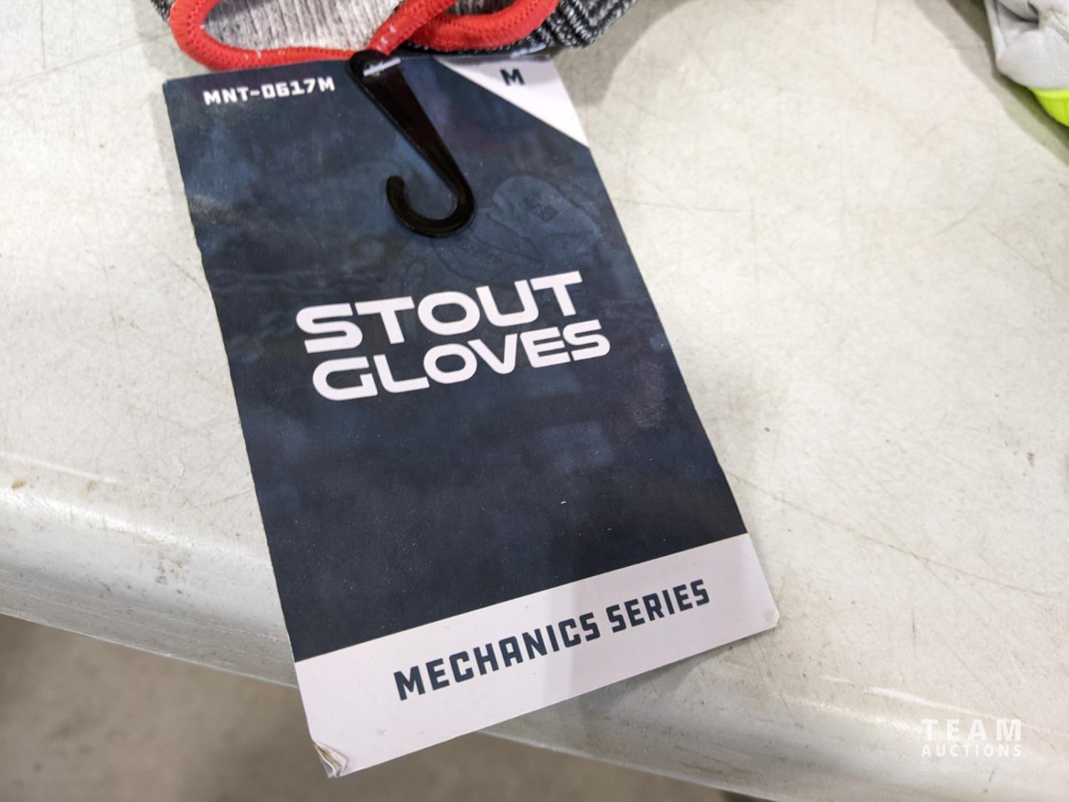 (3) Shock Boss summer yellow large, (2) Ringers medium, Endura welding gloves large, X-Pro welding gloves large, Ringers medium, Stout medium, Stout mechanics medium, Horizon mitts large