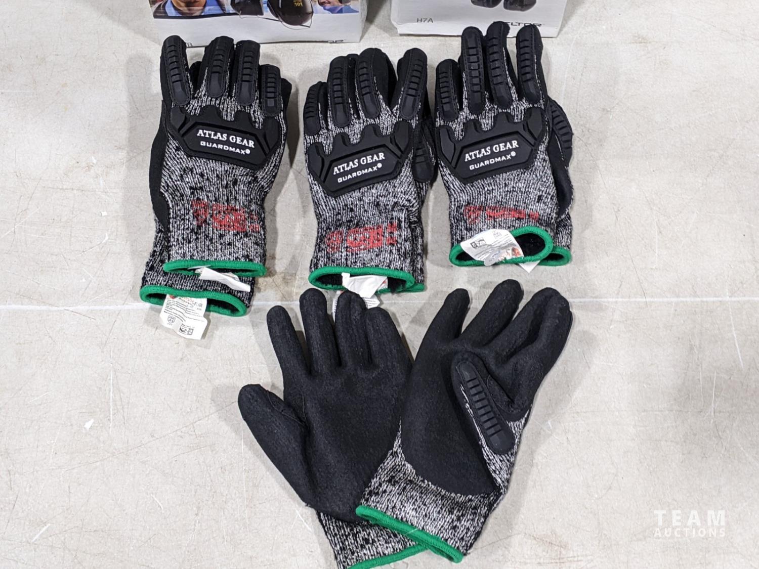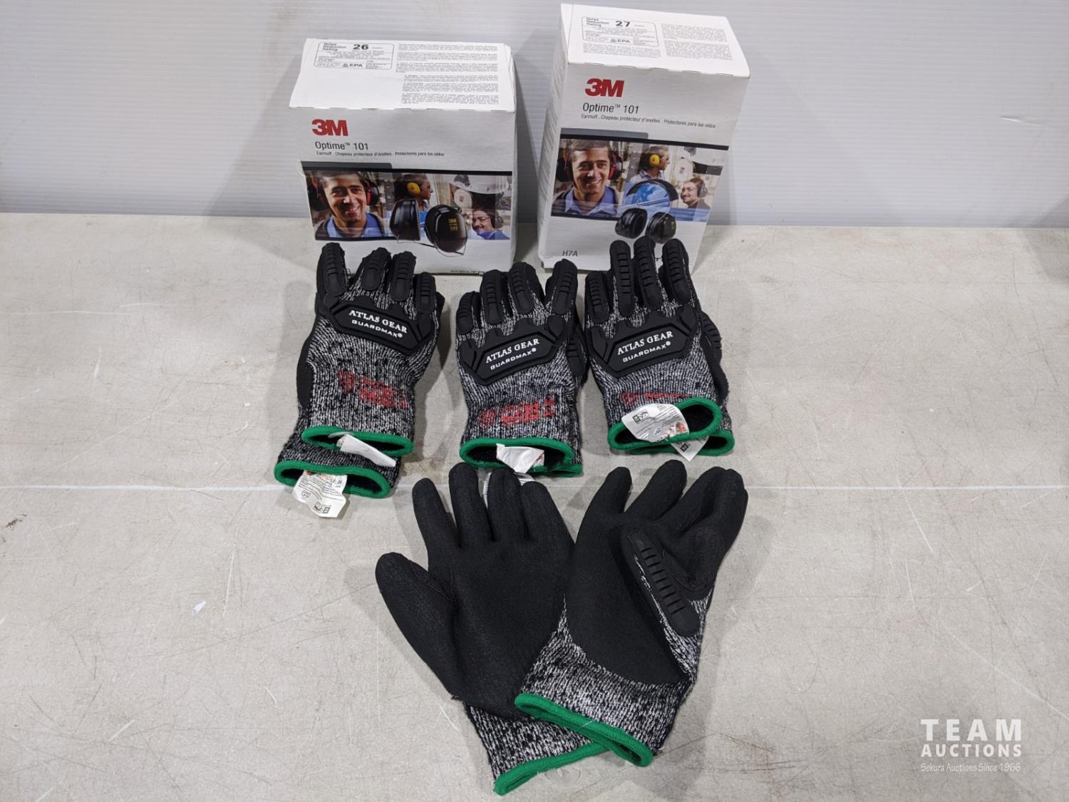 1909 3M H7A Earmuffs, 3M H7B Earmuffs and (4) Pairs of Atlas Gear Gloves Size Medium (Unused)