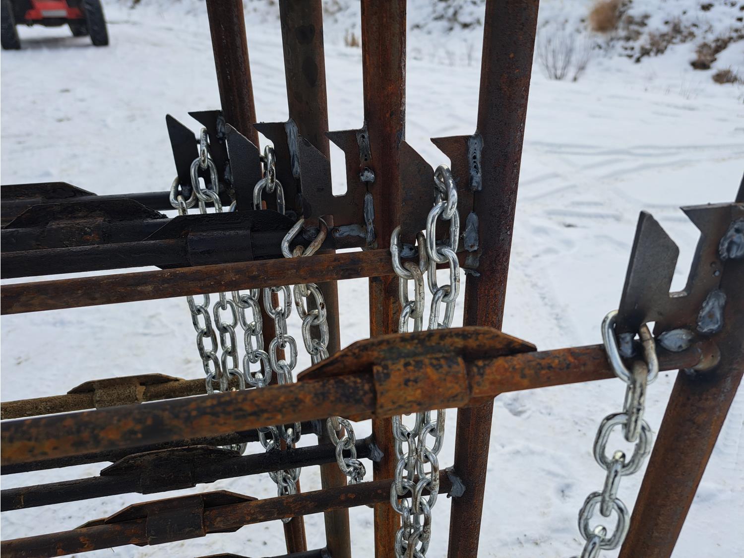 Fabricated with 5/8 inch scraper sucker rod, 57 inches tall, 40 inch wide legs, 1-1/4 inch square tubing top and bottom rails, chain hooks