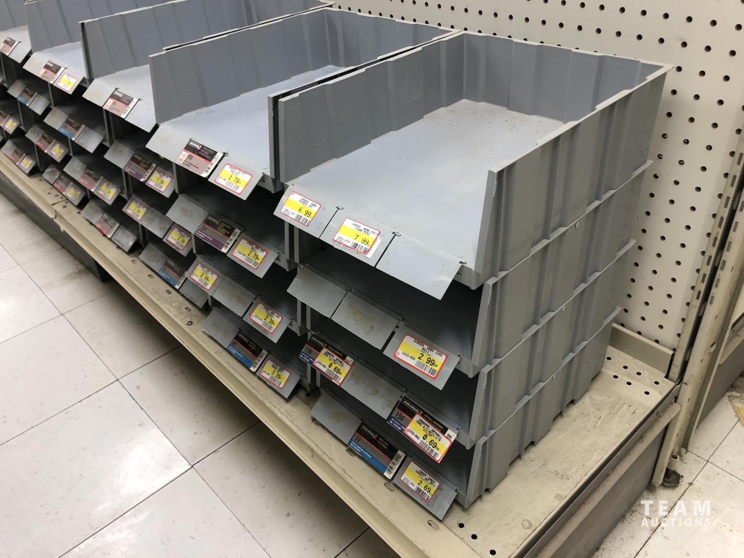 (30±) metal shelves, metal wire racking, (27) plastic 10 inch x 12 inch x 3 inch stacking bins