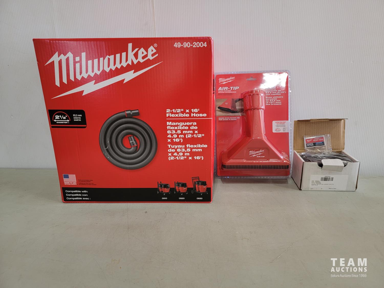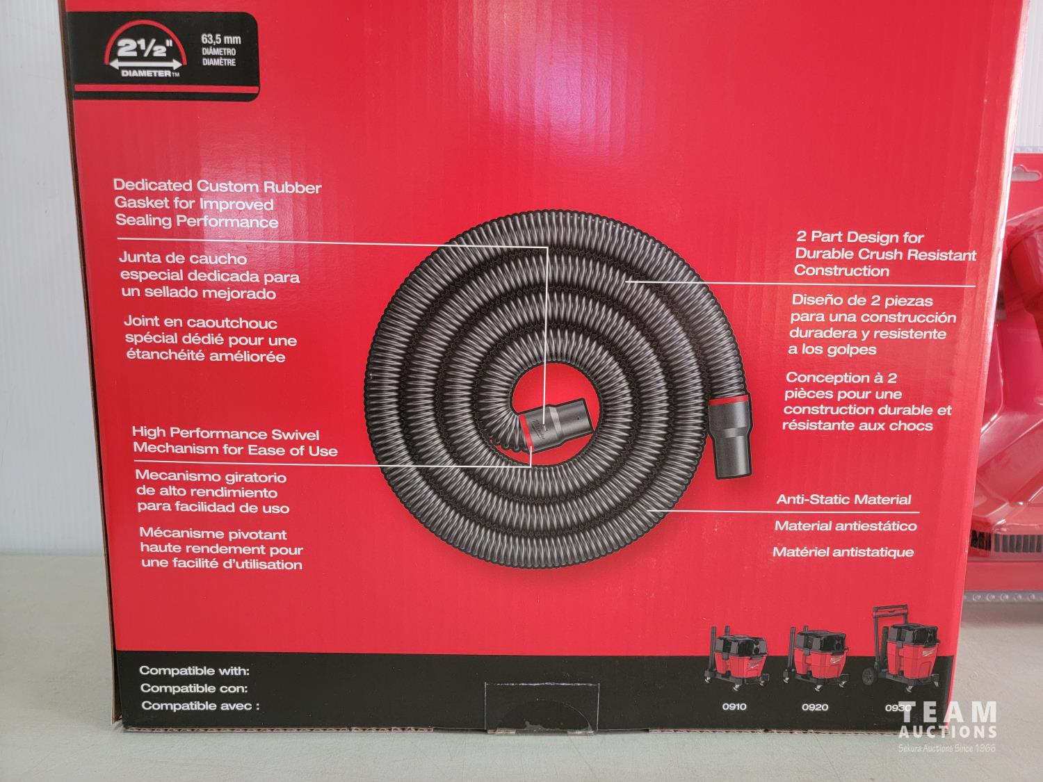 2-1/2 inch x 16 ft flexible vacuum hose, Air-Tip 2-1/2 inch rocking utility nozzle with brushes, Hammer Vac dust extractor with hepa filter
