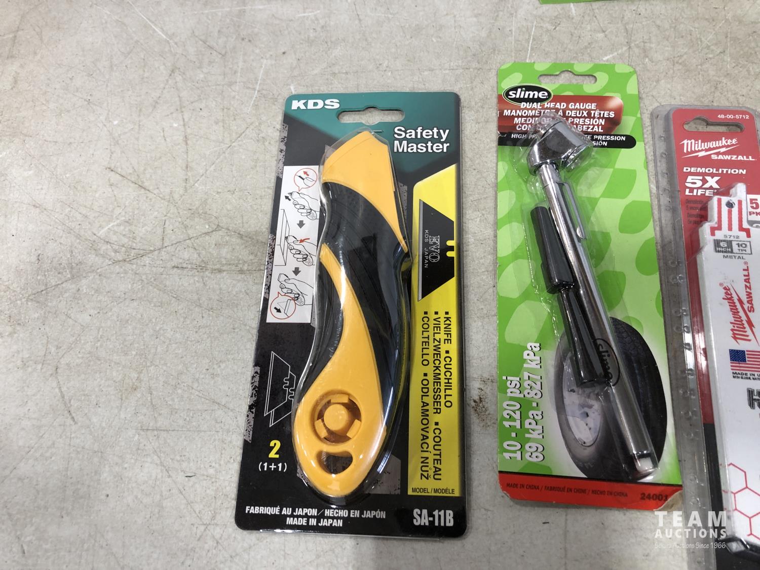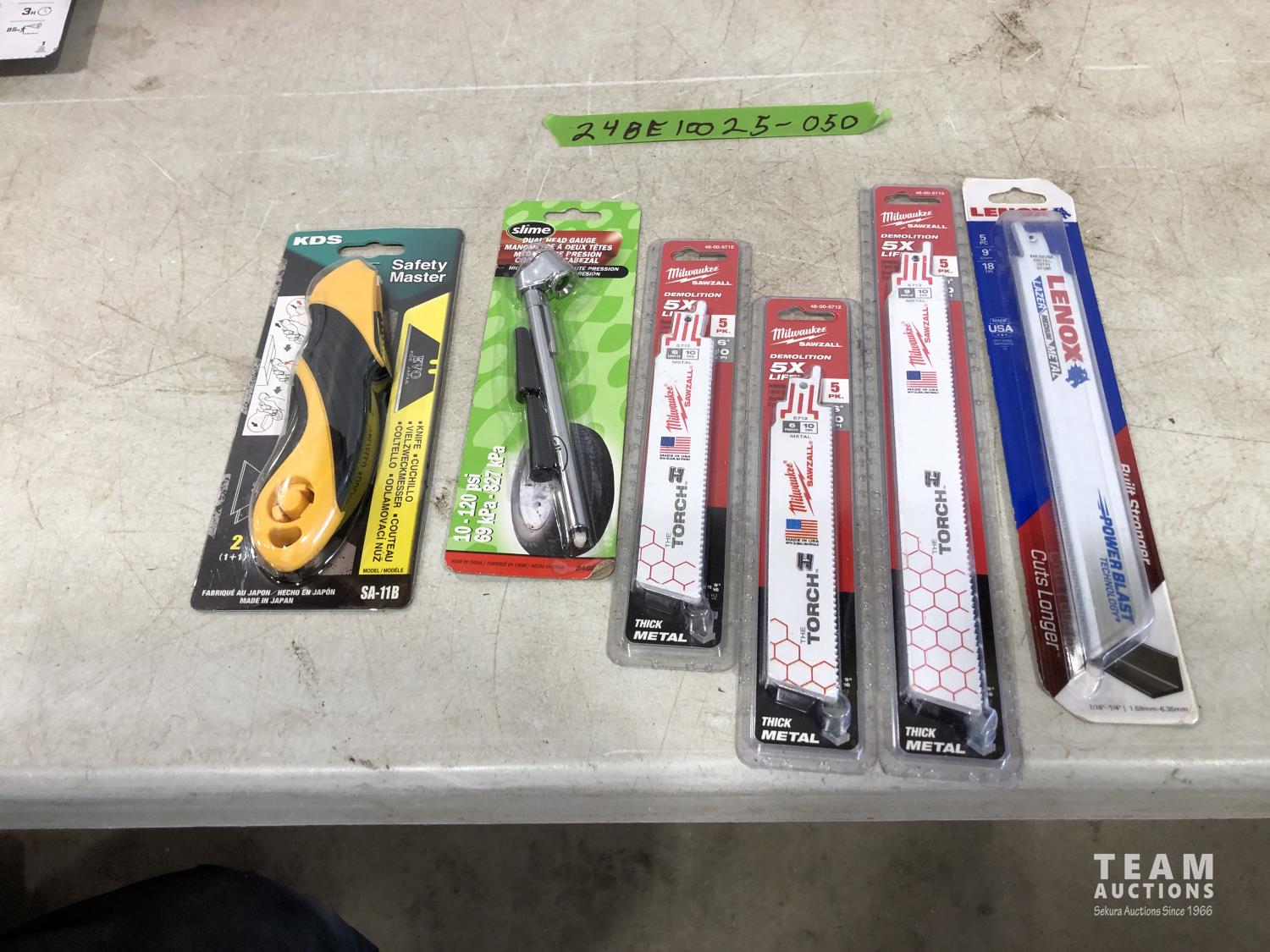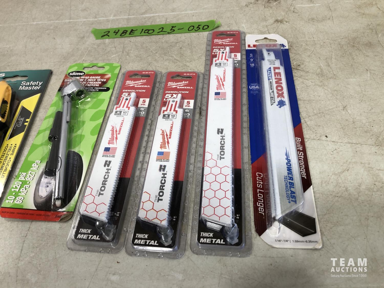 1078 Milwaukee & Lenox Sawzall Blades, Slime Tire Pressure Gauge and Safety Master Utility Knife (Unused)