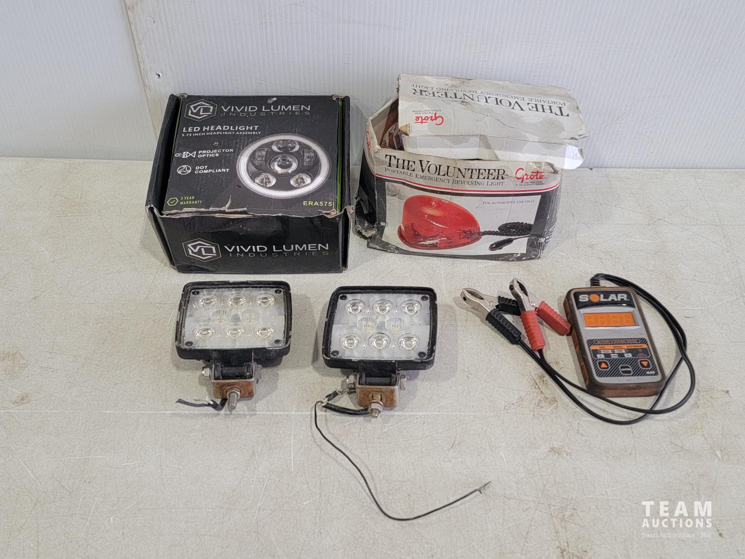 1529 Portable Emergency Revolving Light, LED Headlight, (2) Pod Lights and Solar Battery Tester