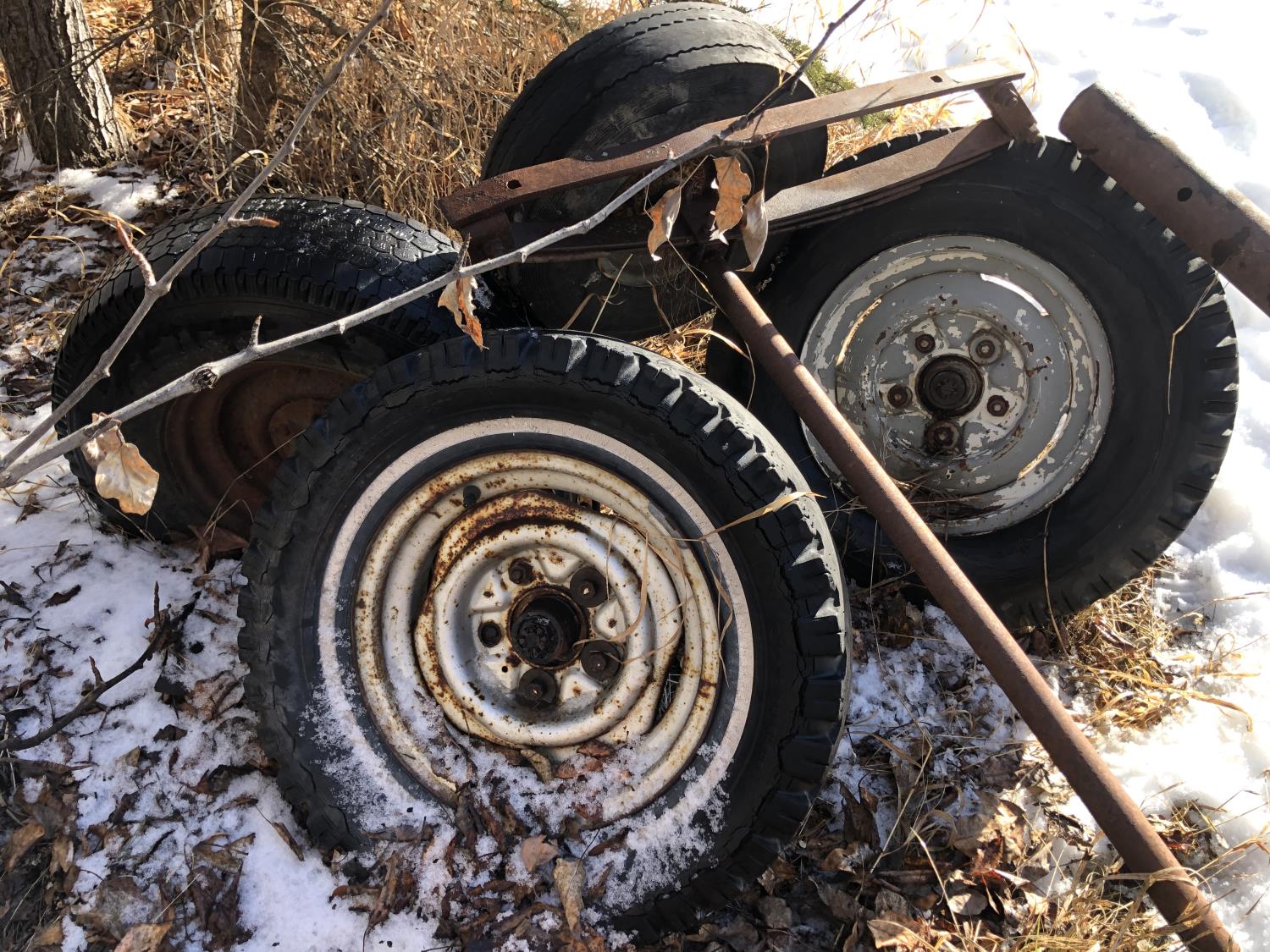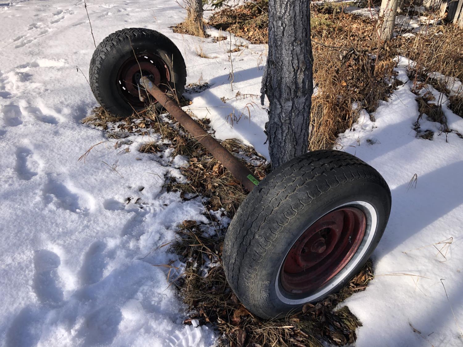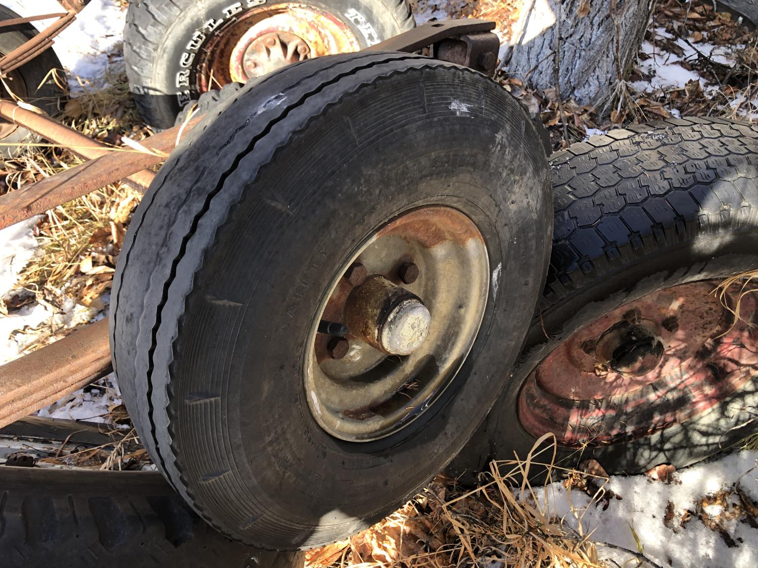 5 bolt 6 ft axle 235/75SR15, 4 bolt utility wagon 4 ft axle with 5.70-8 tires, assorted 5 bolt rims with adjustable axle