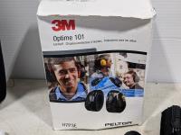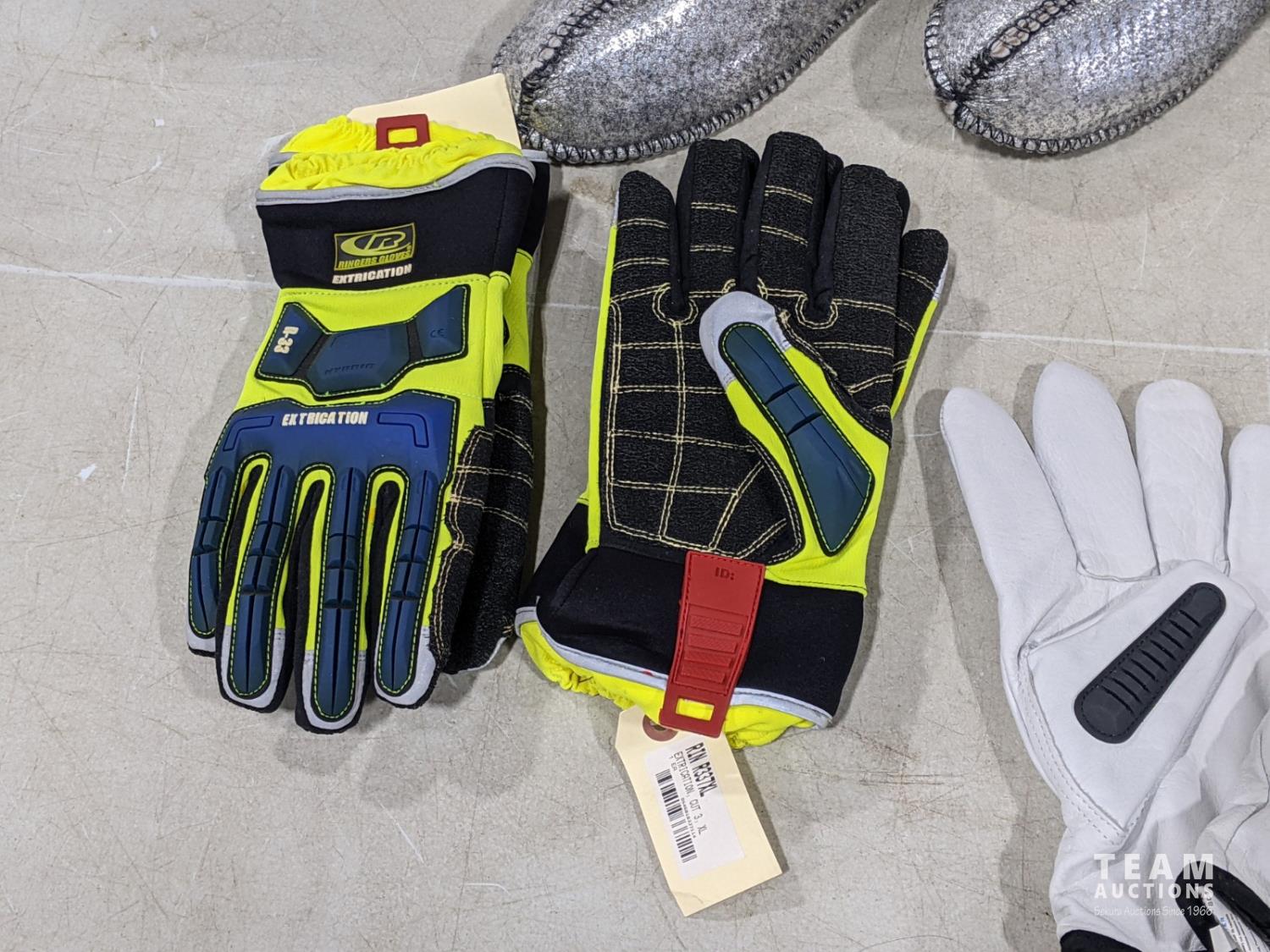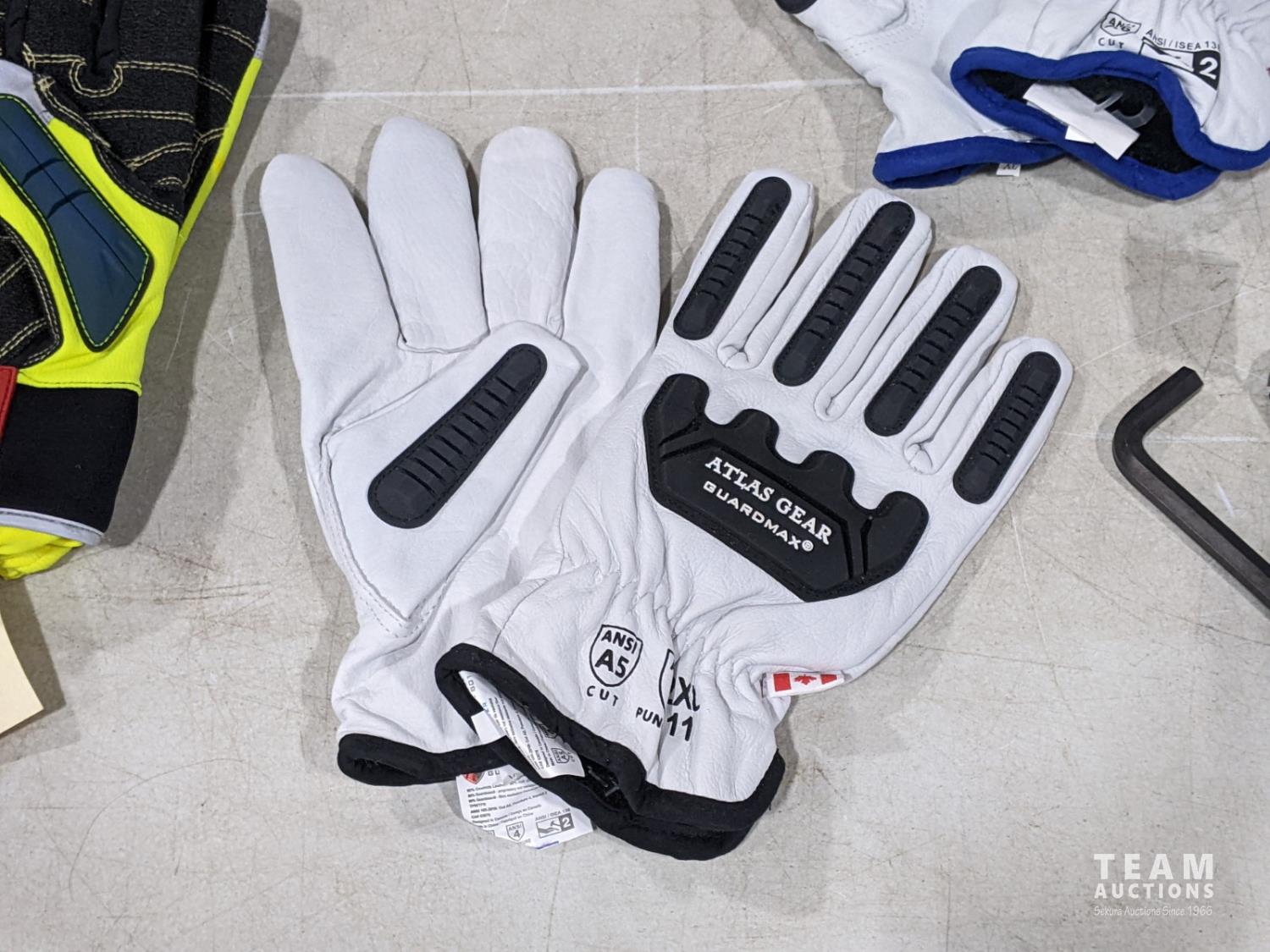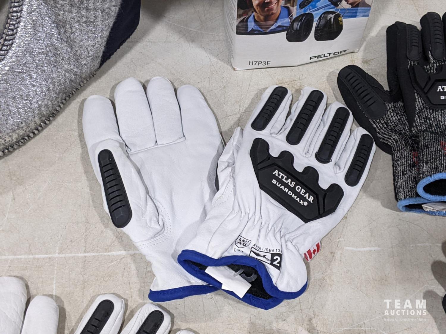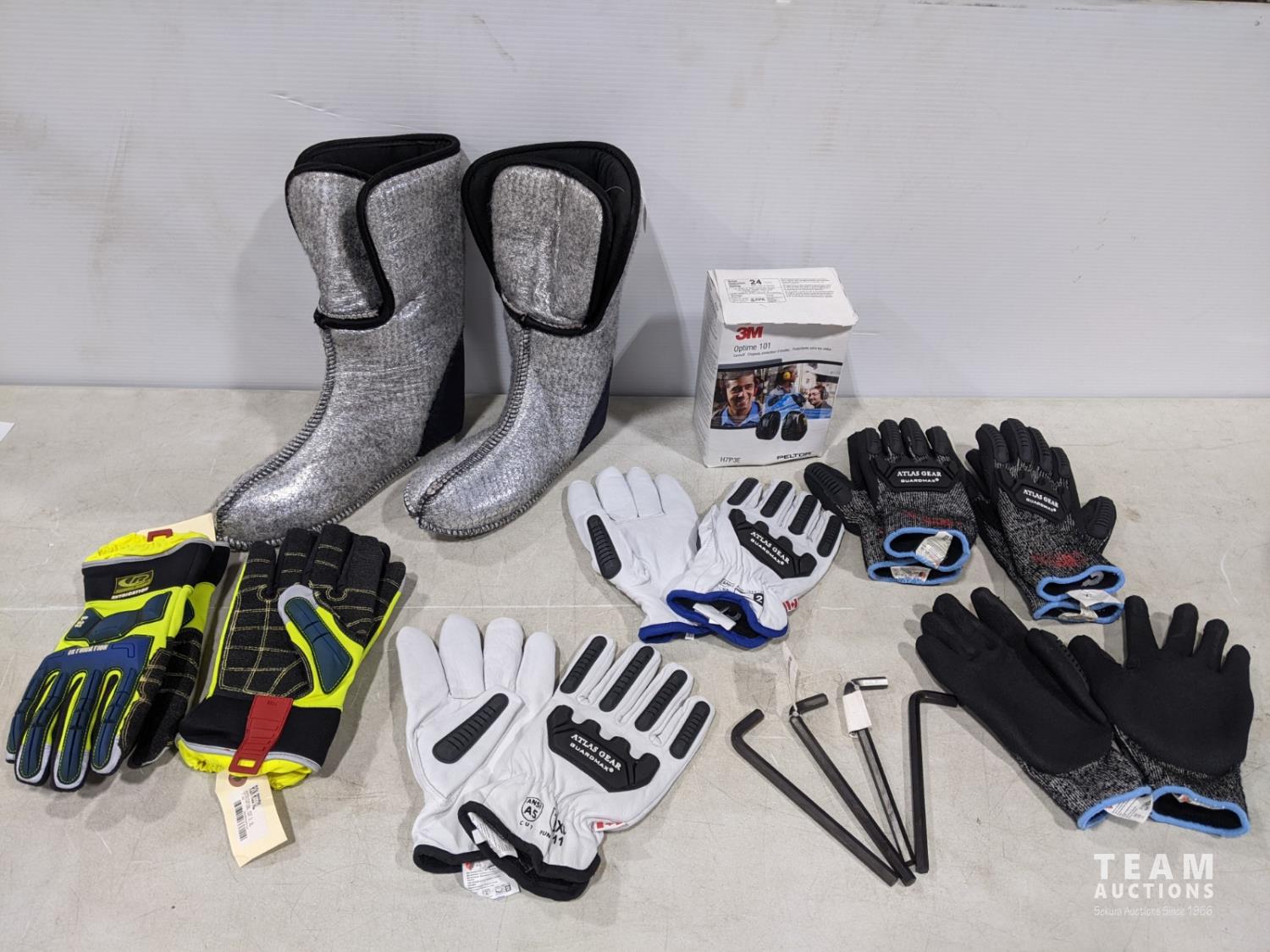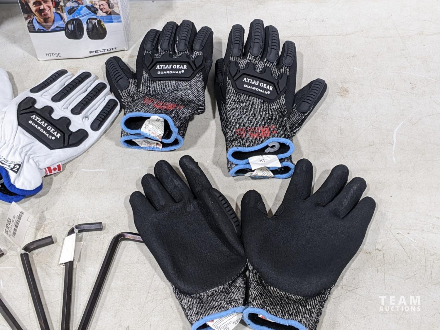 Men's size 8 Baffin boot liners, (2) pairs Ringer XL gloves, (1) Atlas Gear 2XL gloves, (1) Atlas Gear XL leather gloves, (3) Atlas Gear XL gloves, 3 M H7P3E earmuffs