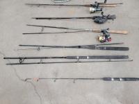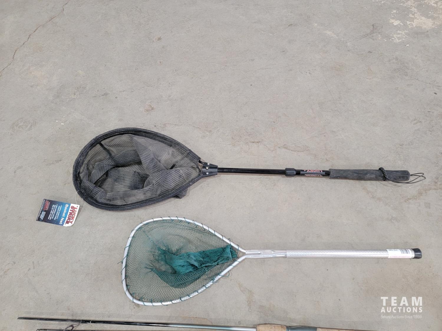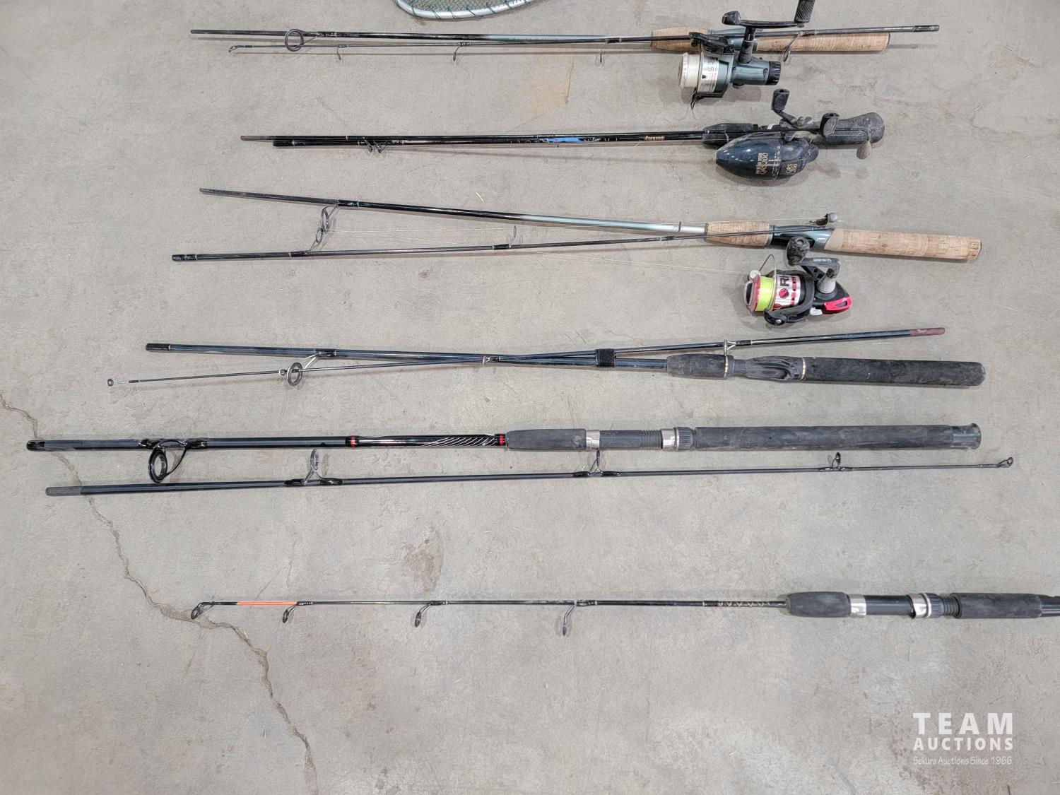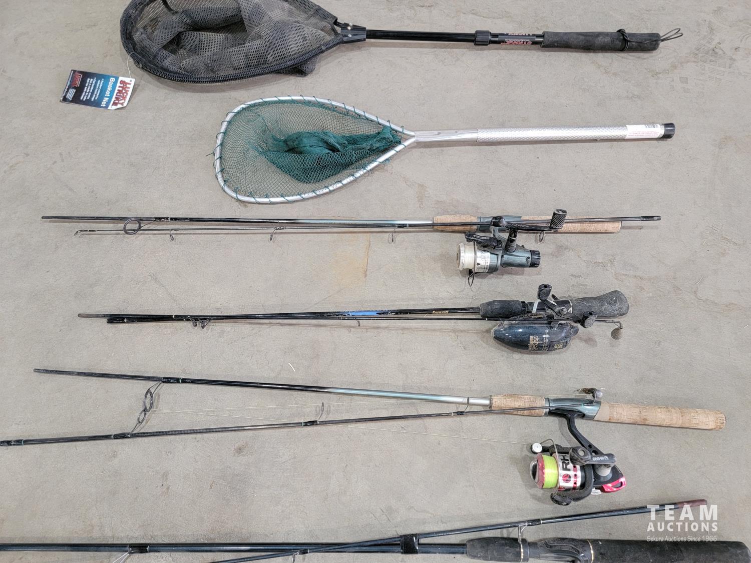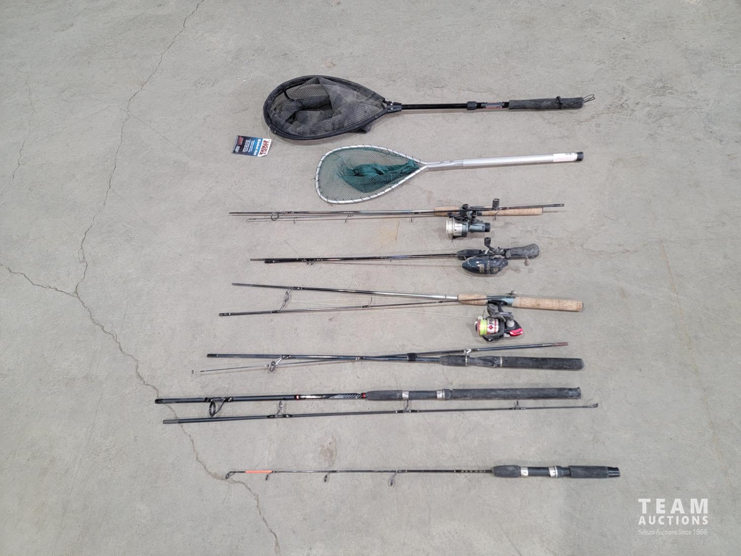 (2) nets, (3) rods with reels, (2) rods, (1) ice fishing rod