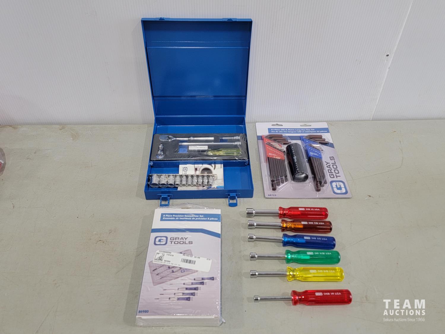 2 pieces 1/4 inch drive socket set, 2 pieces SAE and Metric long hex key set, pieces precision screwdriver set, (6) nut drivers