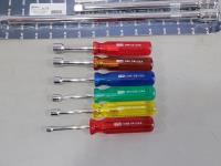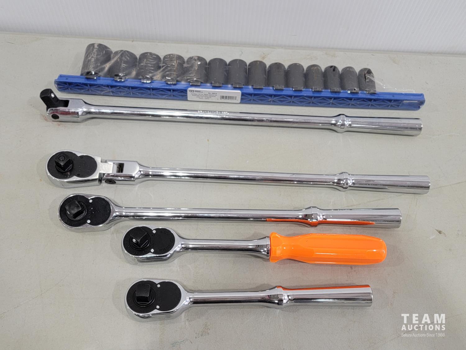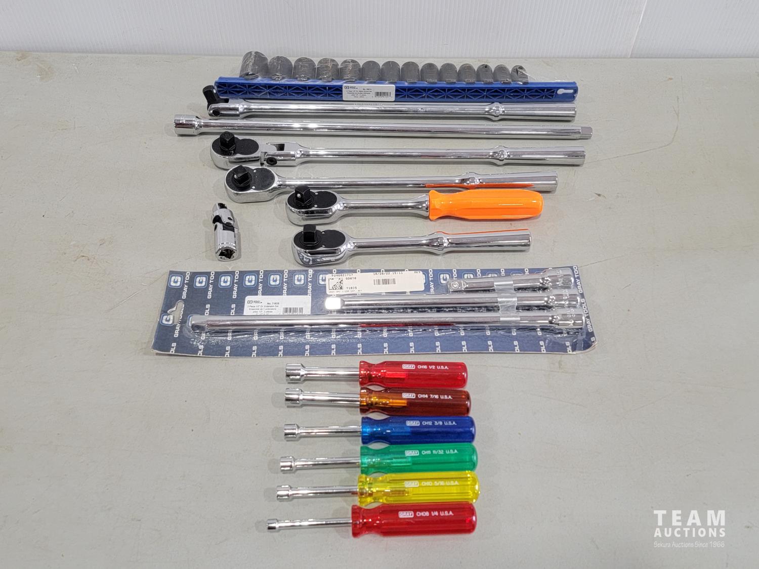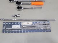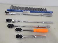 (4) 1/2 inch drive ratchets, qty of extensions, (6) nut drivers: 1/2 inch, 7/16 inch, 3/8 inch, 11/32 inch, 5/16 inch, 1/4 inch