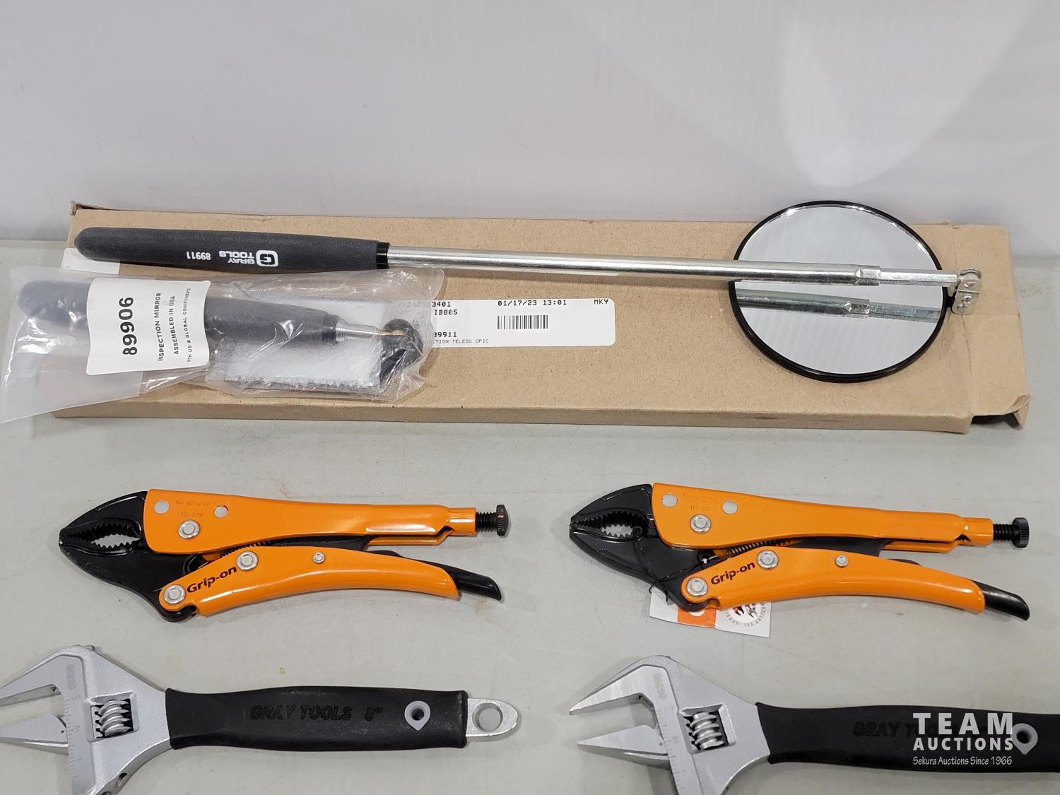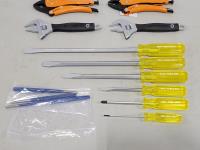 (2) telescopic inspection mirrors, (2) Grip-On locking pliers, (2) 8 inch adjustable wrenches, (6) screwdrivers, (3) punches