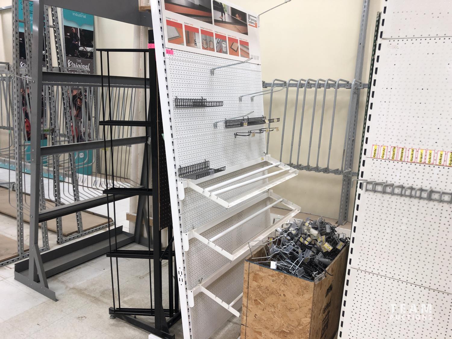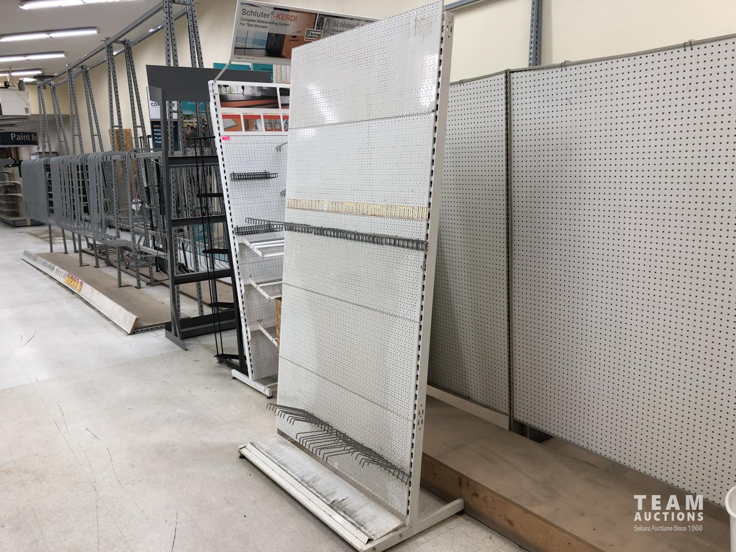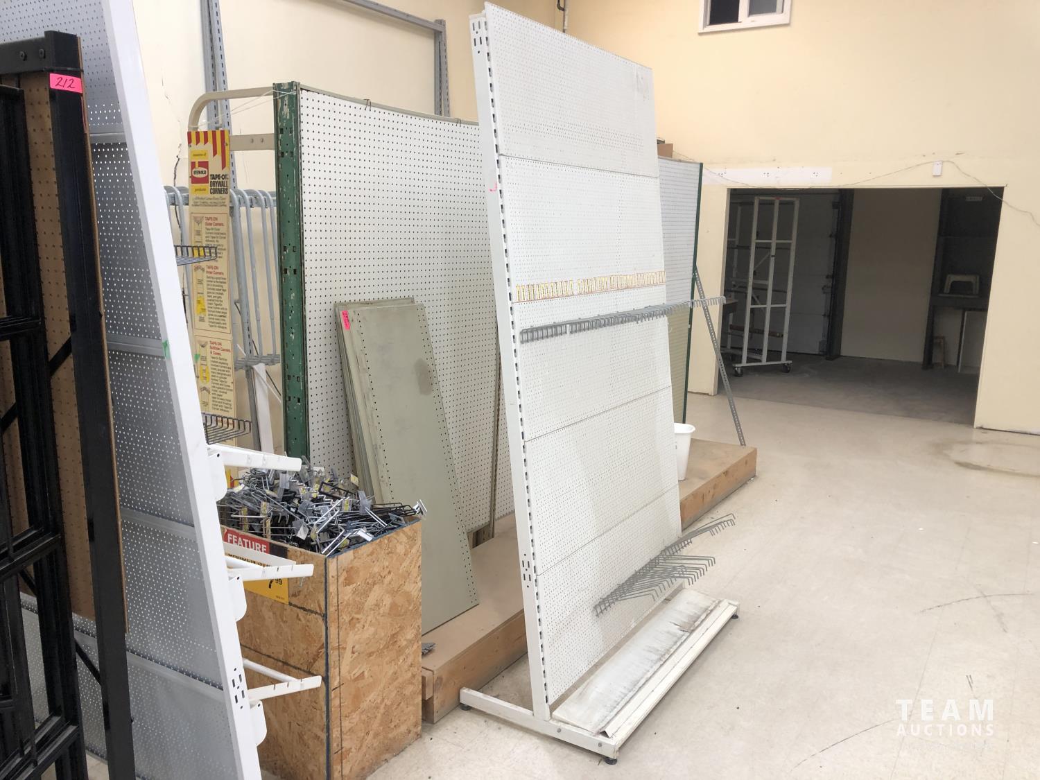 (2) metal display racks, (2) metal peg board displays, box of metal hardware, 3 ft x 12 ft doubled sided peg board display
