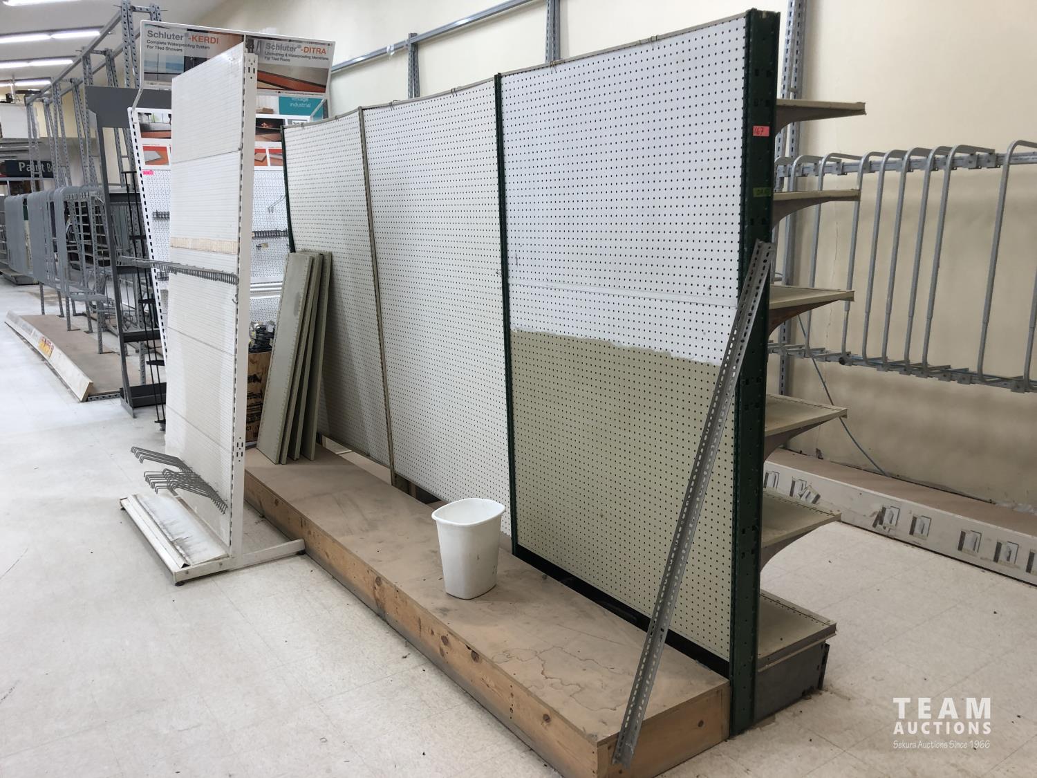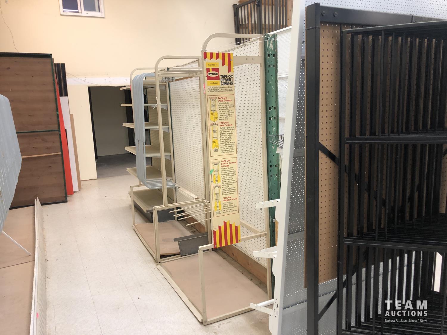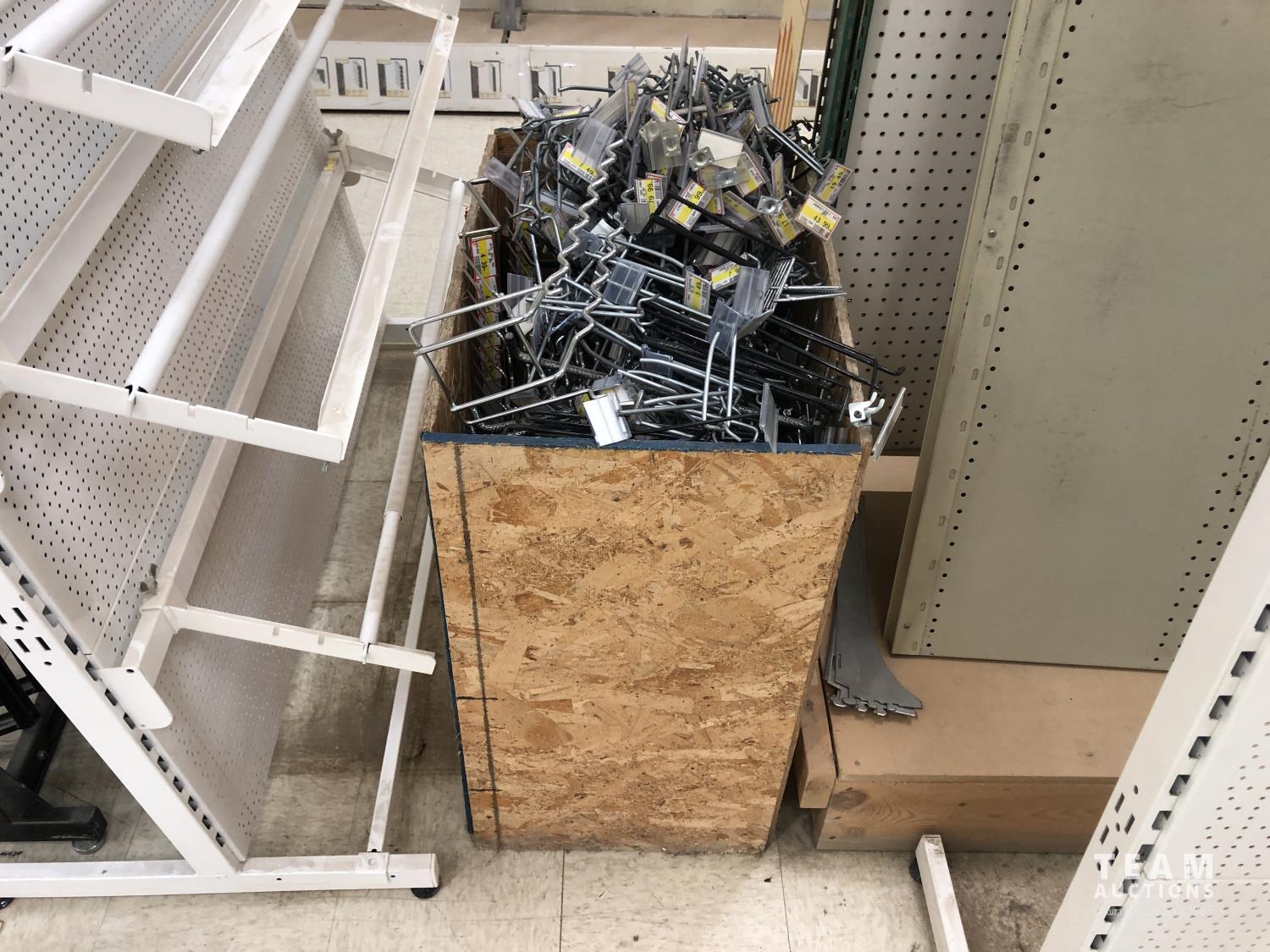 (2) metal display racks, (2) metal peg board displays, box of metal hardware, 3 ft x 12 ft doubled sided peg board display