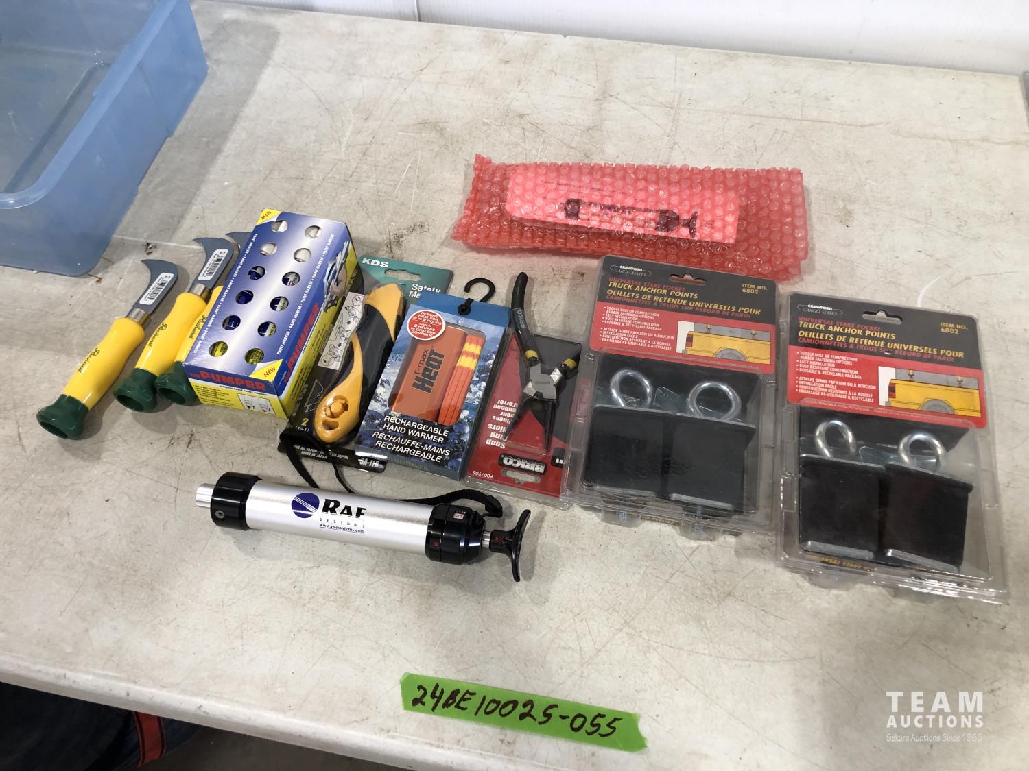 Rae tube tester, hook knives, box of markers, truck anchors, 7 inch snap ring pliers, rechargeable hand warmer, utility knife
