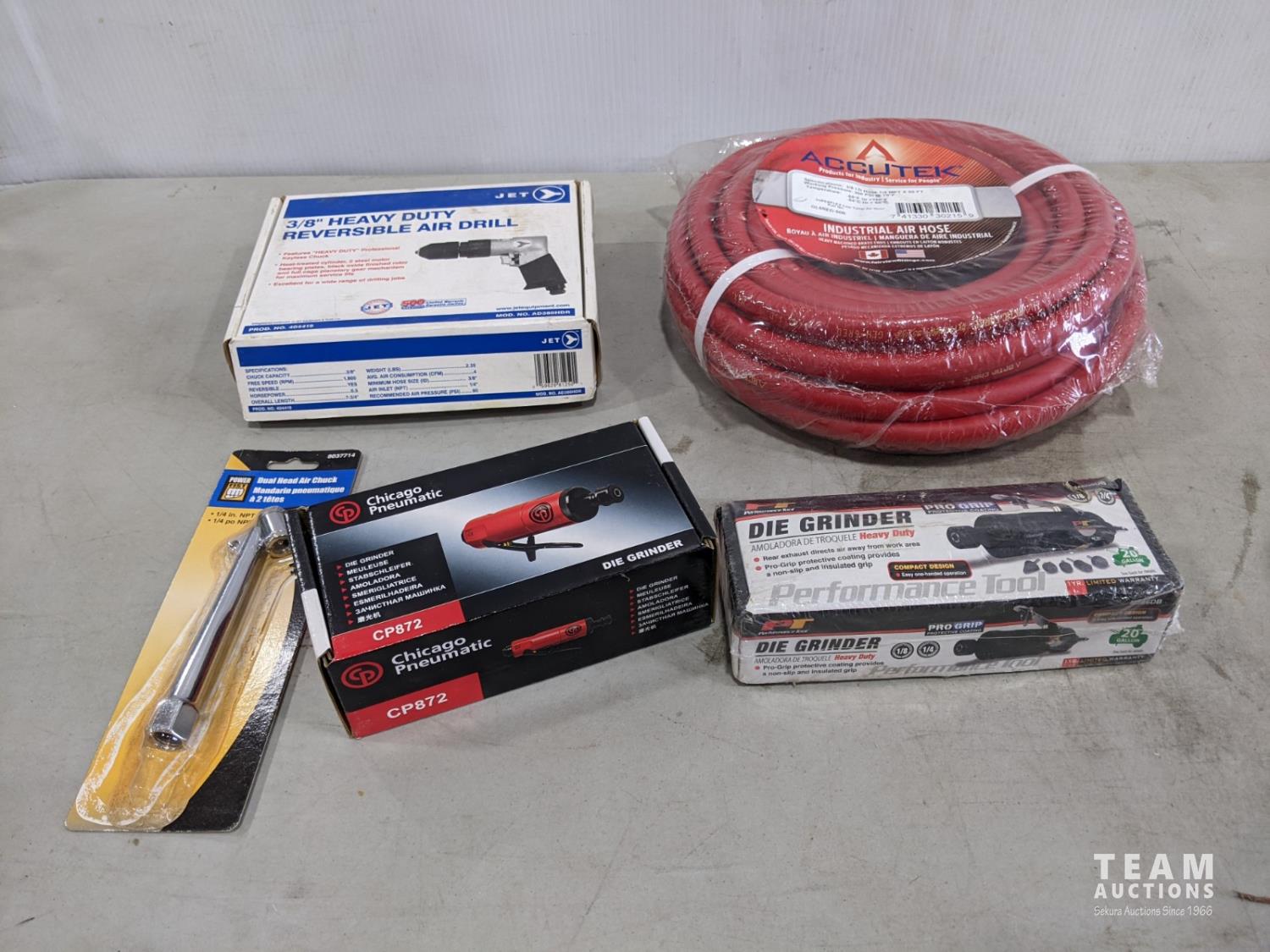 Accutek 3/8 inch x 50 ft air hose, Jet 3/8 inch air drill, Powerfist 1/4 inch air chuck, Chicago pneumatic die grinder, PT die grinder