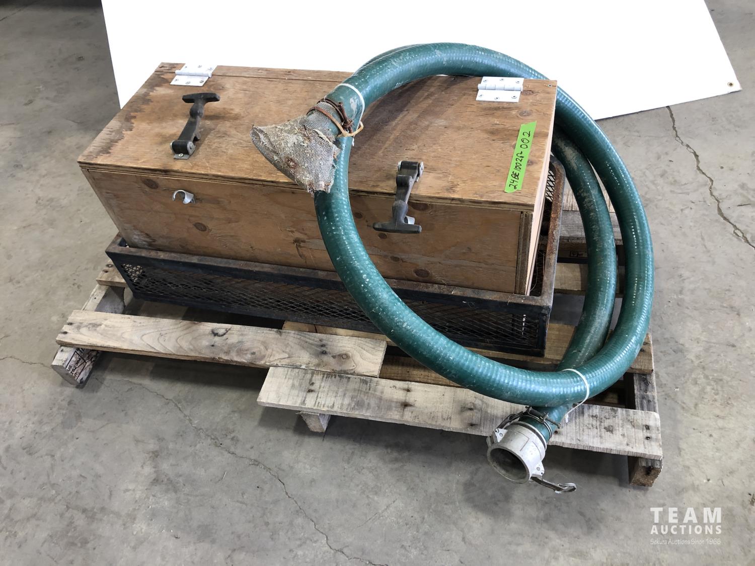 33.5 inch x 13.5 inch x 13.5 inch wooden box, 2 inch suction hose w/cam lock, 36 inch x 17 inch 6.5 inch metal basket
