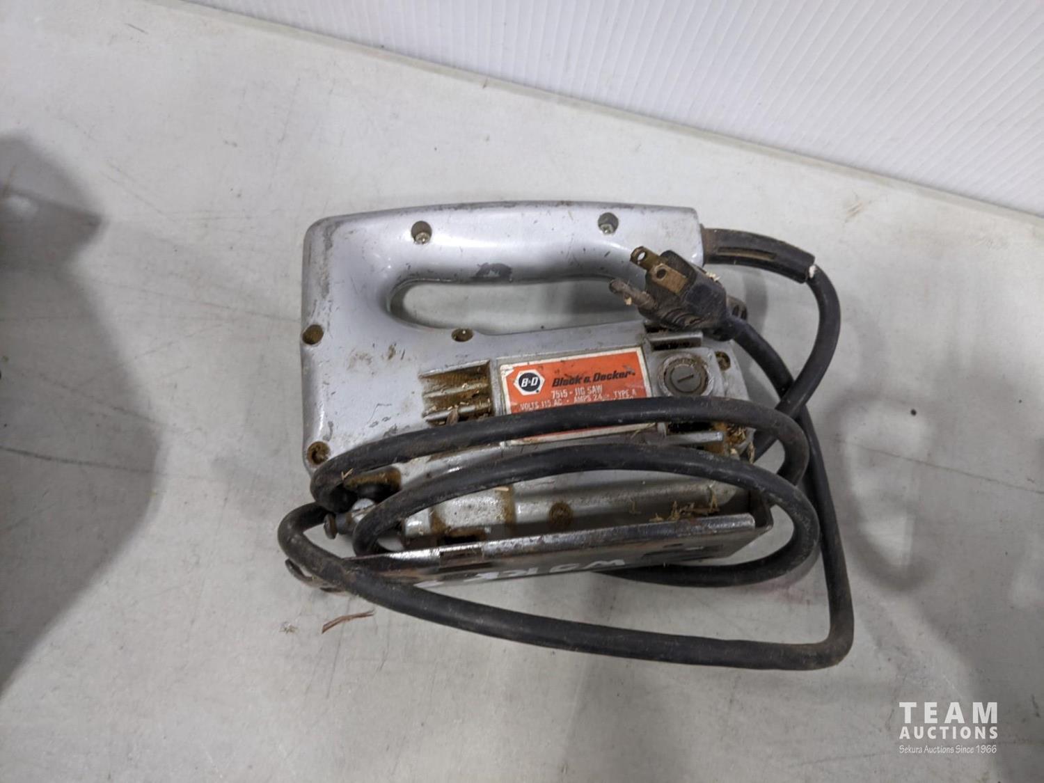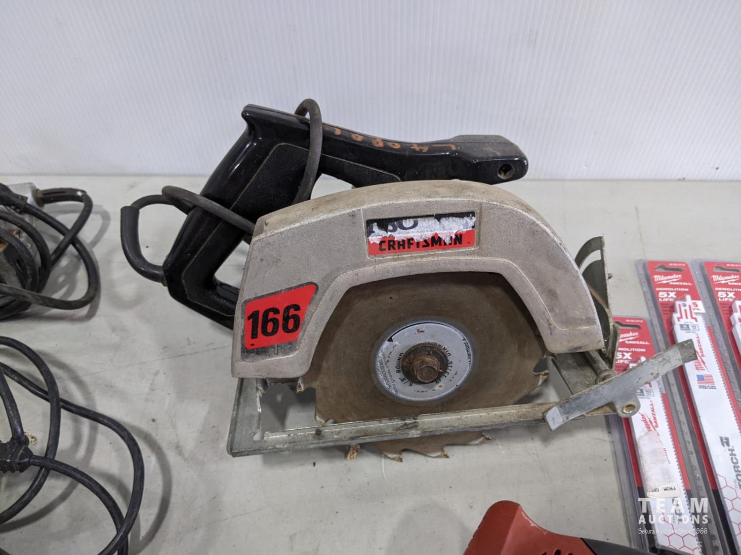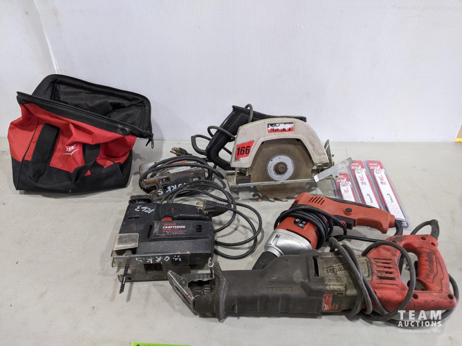 B&D jig saw, Craftsman jig saw, Craftsman 7-1/4 inch circular saw, King Canada 3/8 inch drill, Milwaukee sawzall with blades and bag