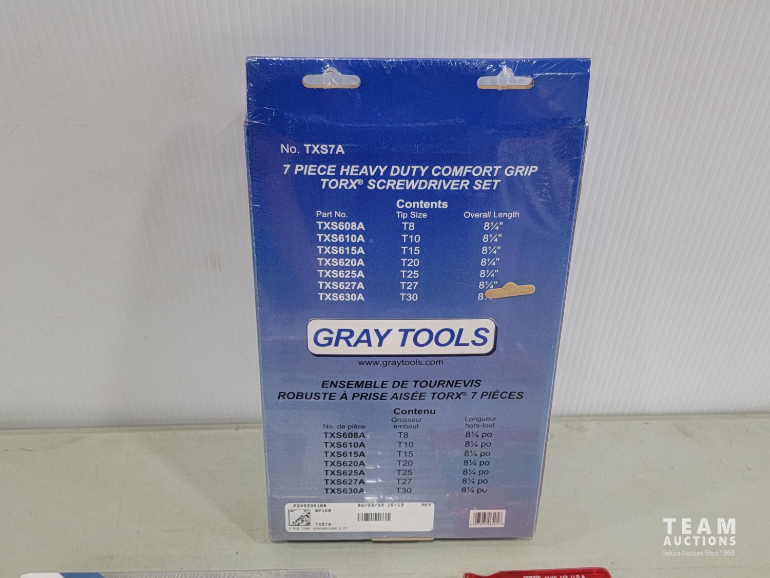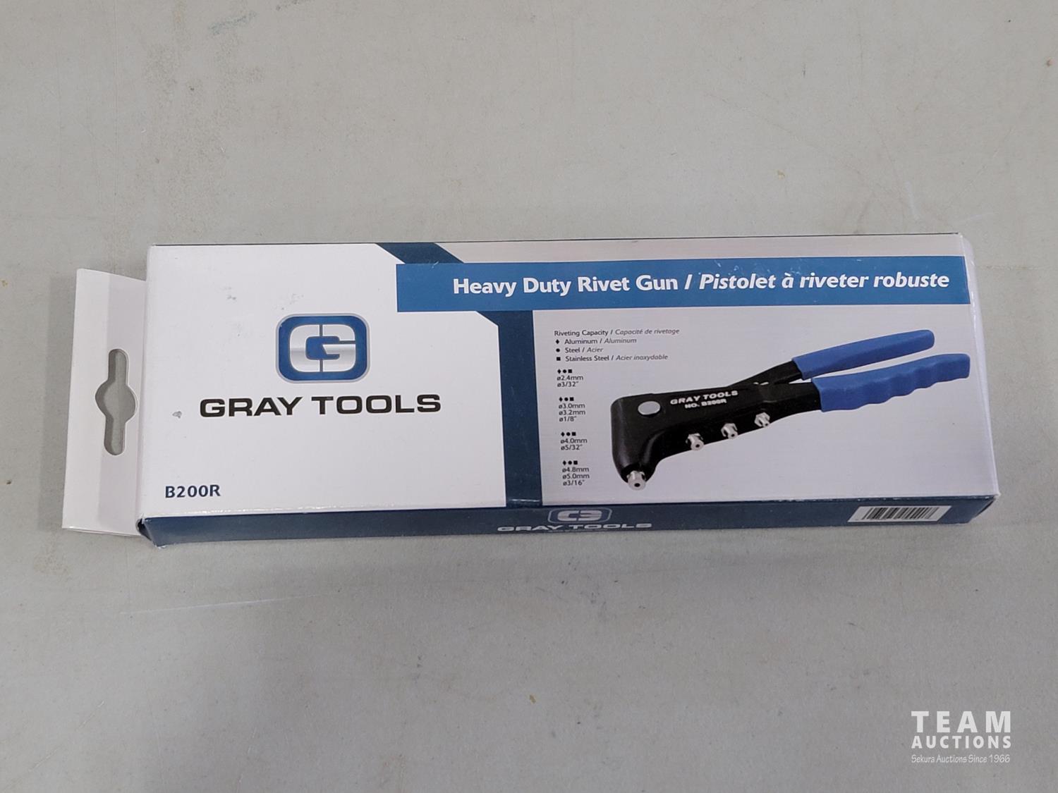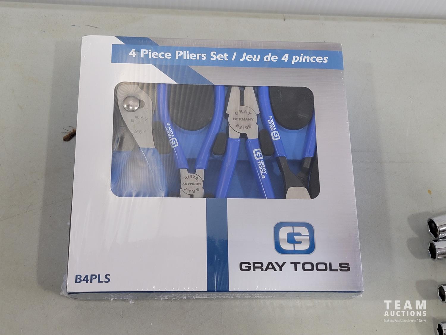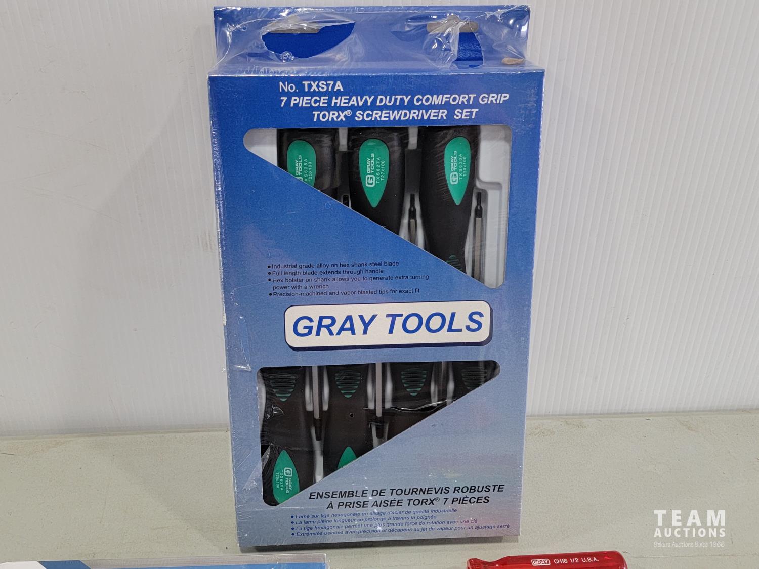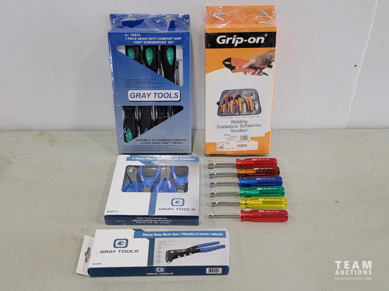 Gray Tools piece screwdriver set, Grip-on piece locking pliers, Gray Tools 4 pieces pliers set, Gray Tools heavy duty rivet gun, (6) Gray nut drivers: 1/2 inch, 7/16 inch, 3/8 inch, 11/32 inch, 5/16 inch, 1/4 inch