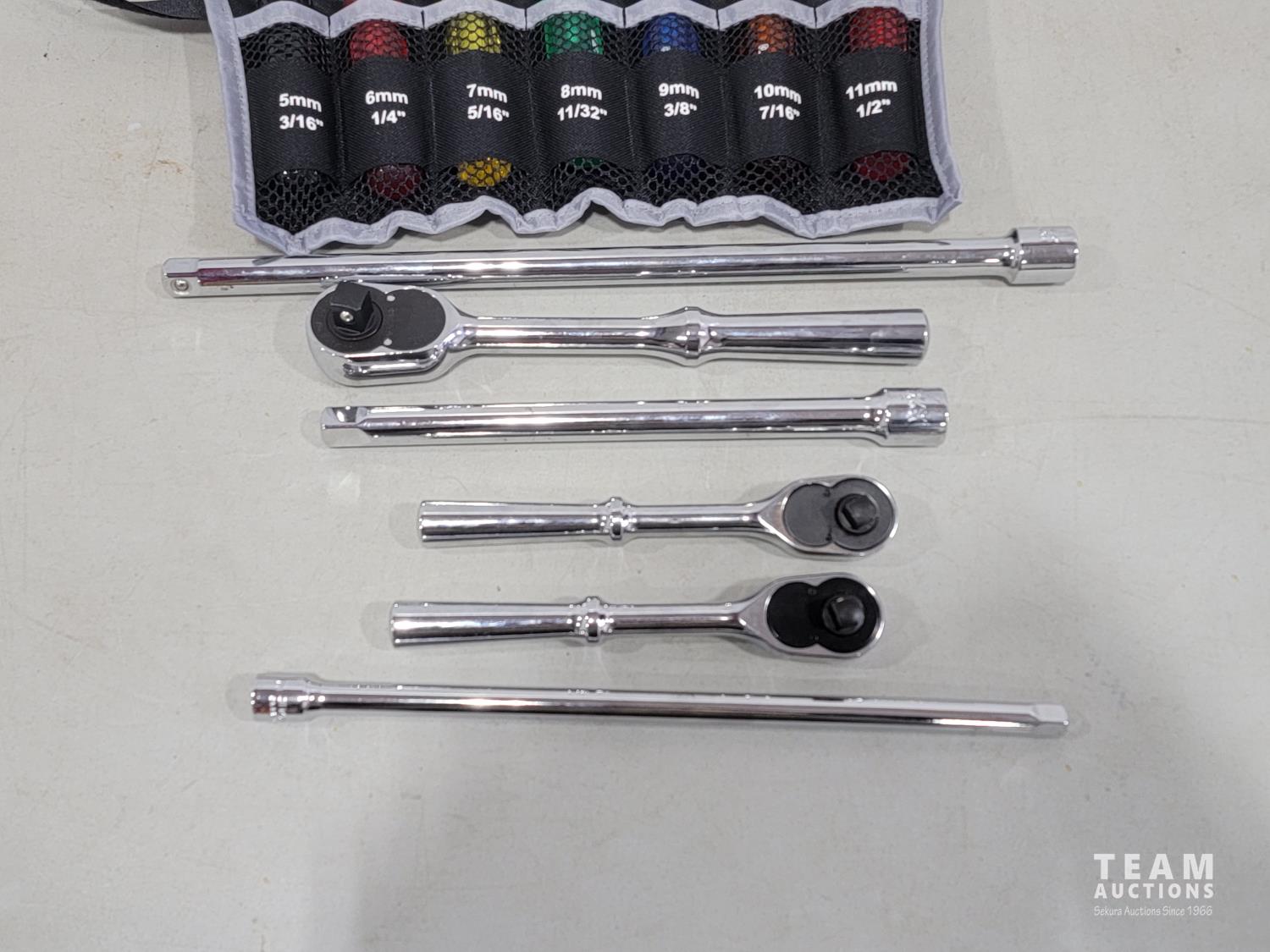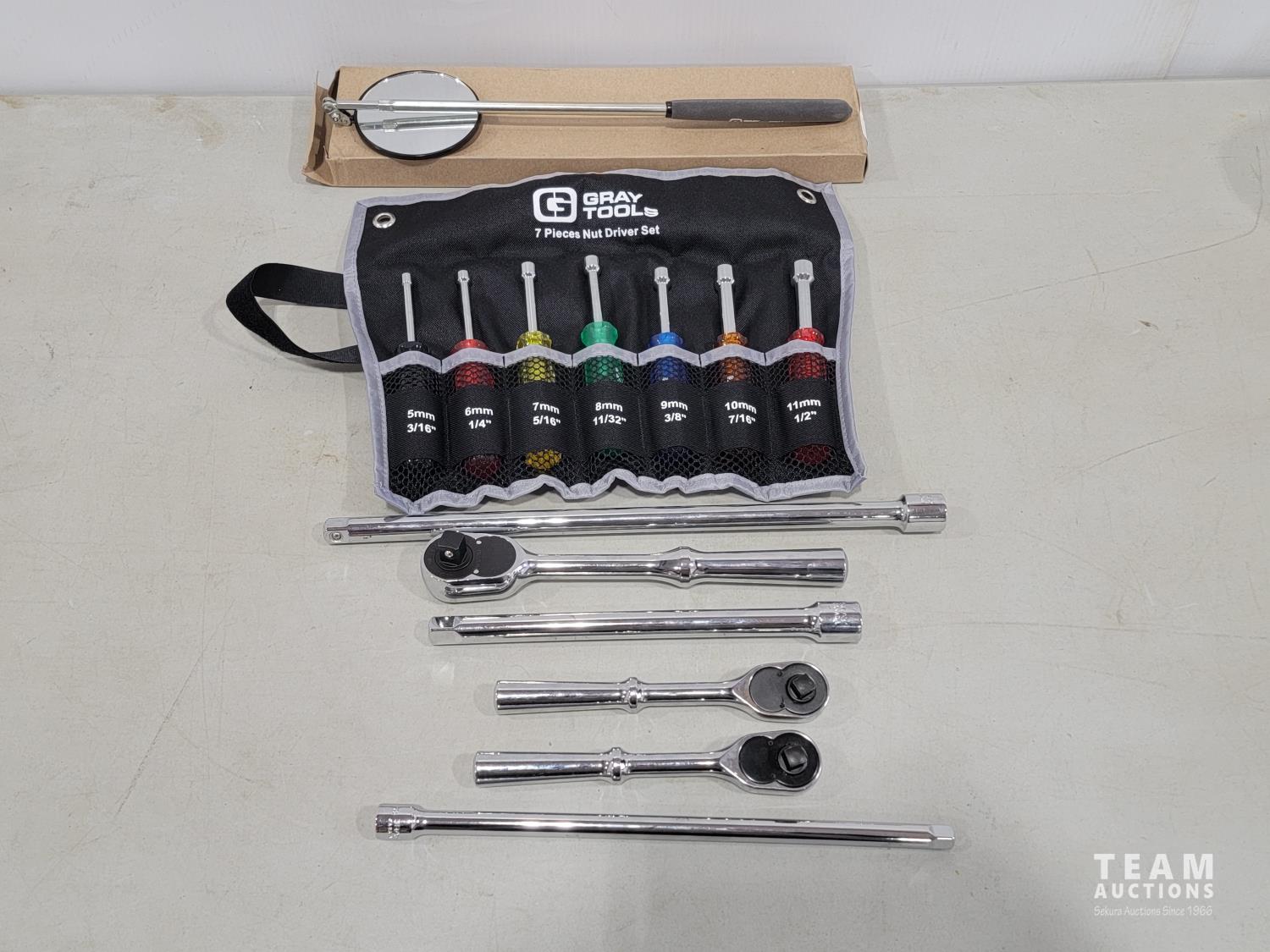 Telescopic inspection mirror, 7 piece nut driver set, 1/2 inch ratchet and (2) extensions, (2) 3/8 inch ratchets and extensions