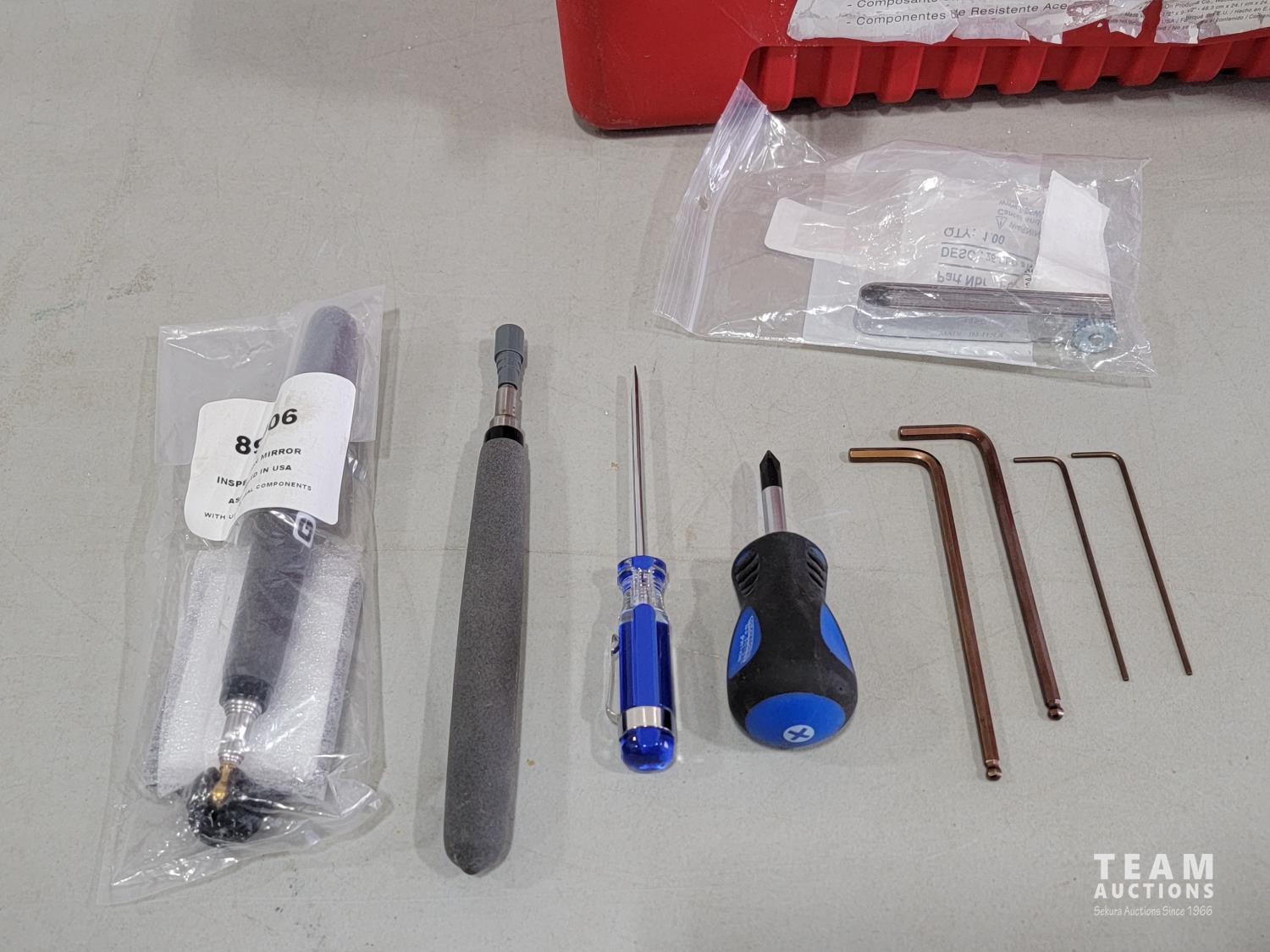 Metric and SAE wrenches, (6) nut drivers, (4) hex keys, (2) screwdrivers, telescopic inspection mirror, telescopic magnet, 25 piece feeler gauge