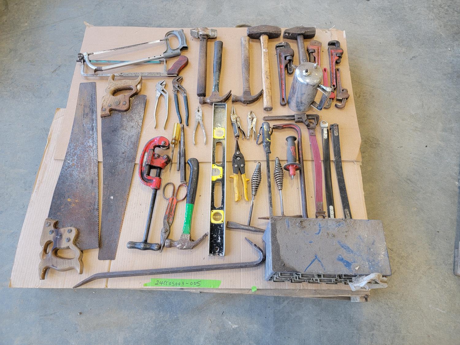 Hammers, pipe wrenches, saws, pipe cutter, vise grips, pliers