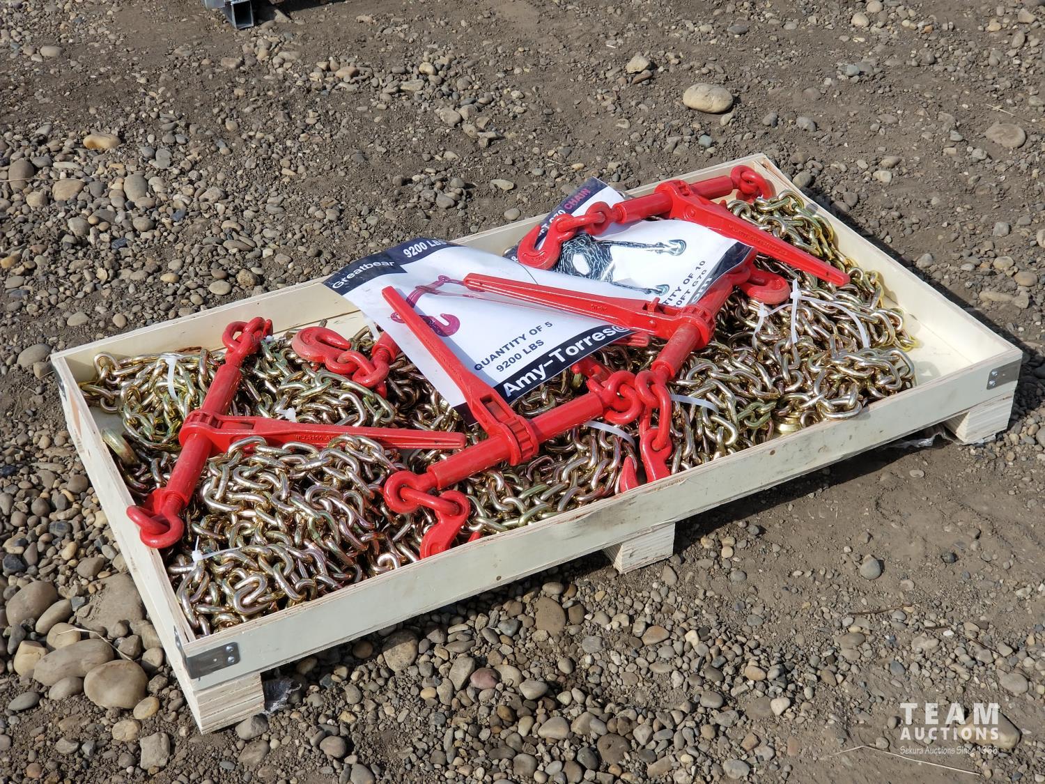 132 Greatbear (5) 5400 lb Ratchet Binder and (10) 5/16 Inch 20 Ft G70 Chain (Unused)