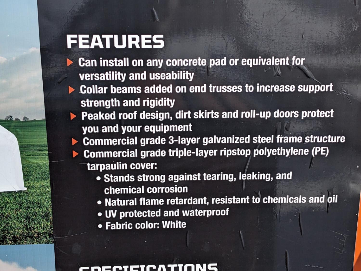 Heavy duty 11 oz PE cover, drive through doors, peak ceiling