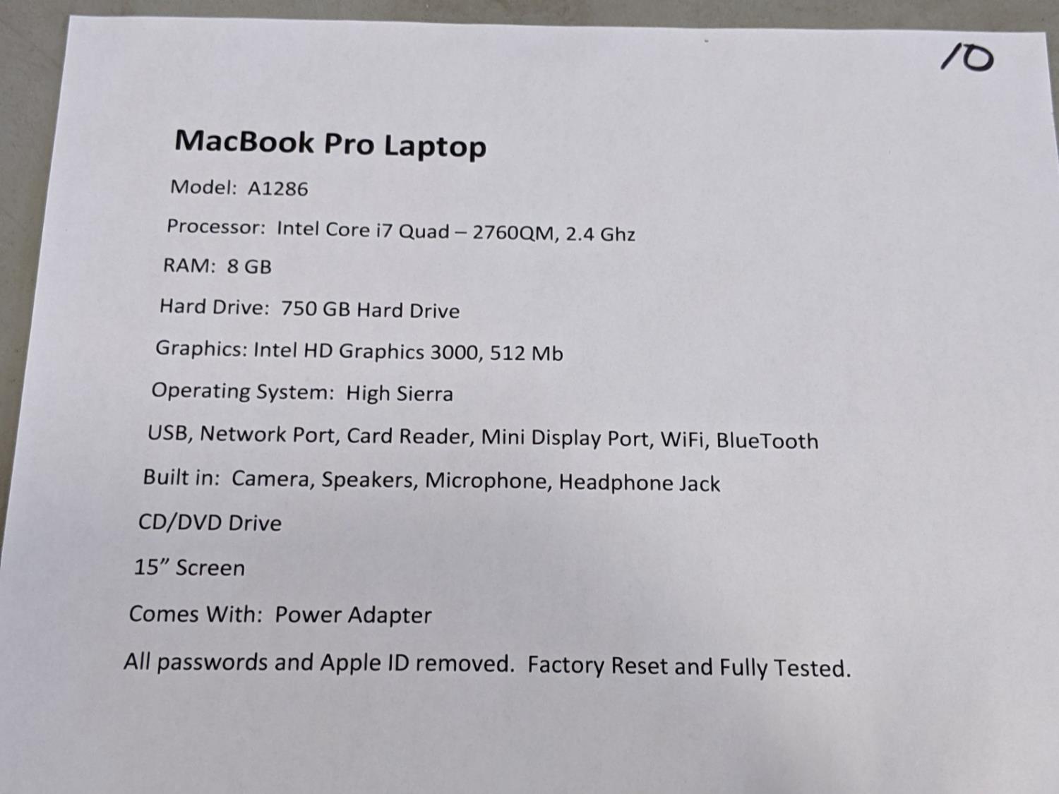 1870 Apple MacBook Pro A1286 15 Inch Laptop