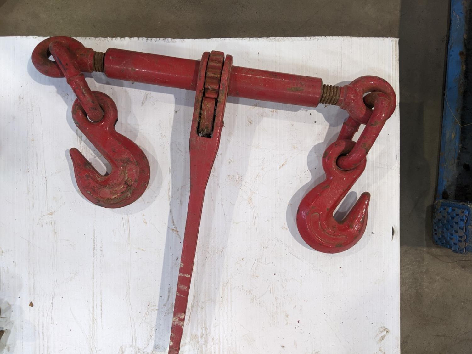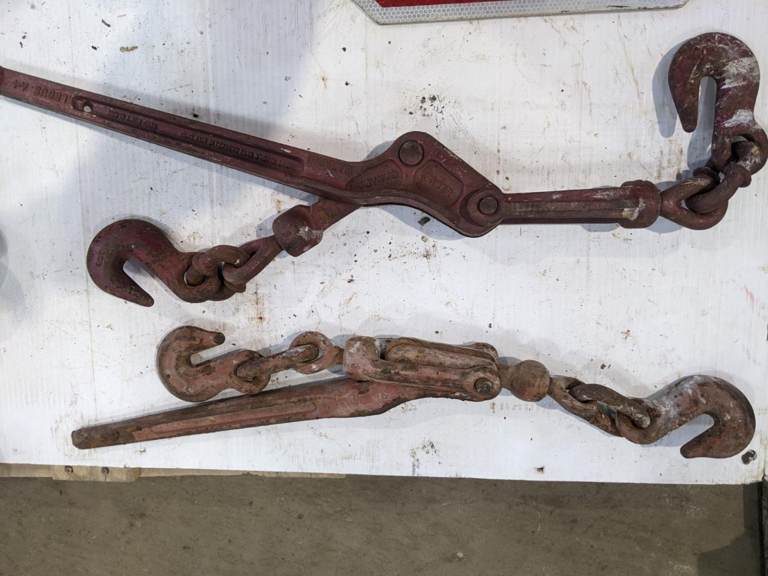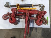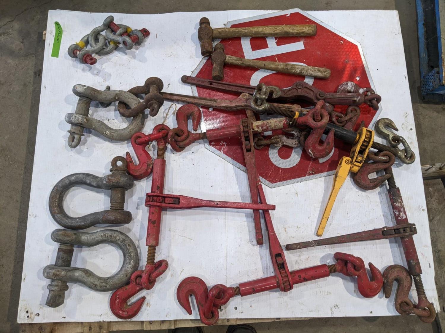 (5) ratchet boomers, (2) snap boomers, (3) 1-1/2 inch shackles, (3) 3/4 inch shackles, (2) hammers, stop sign