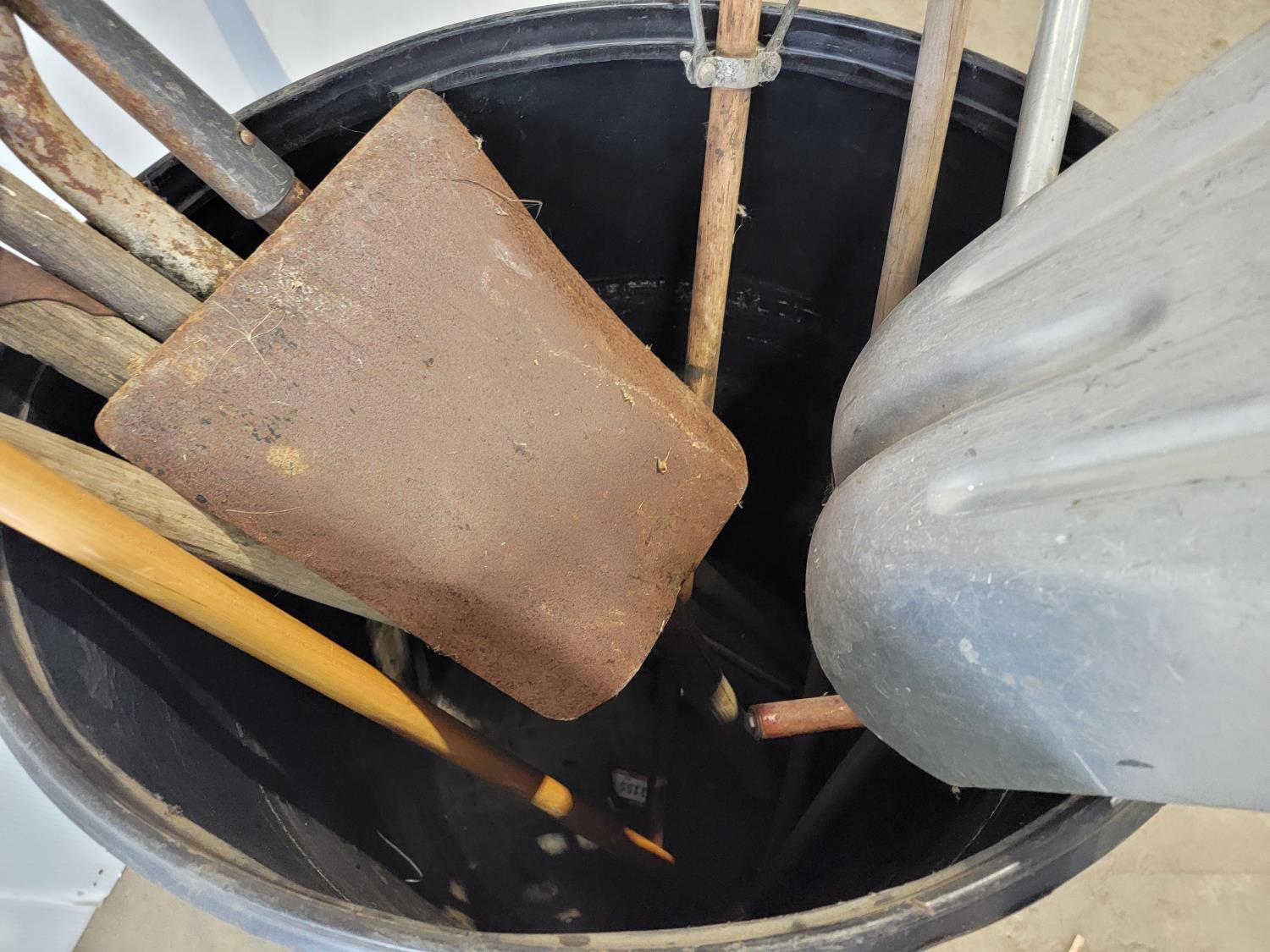 Shovels, hoe, brooms, scythe, ice chipper, pressure sprayer