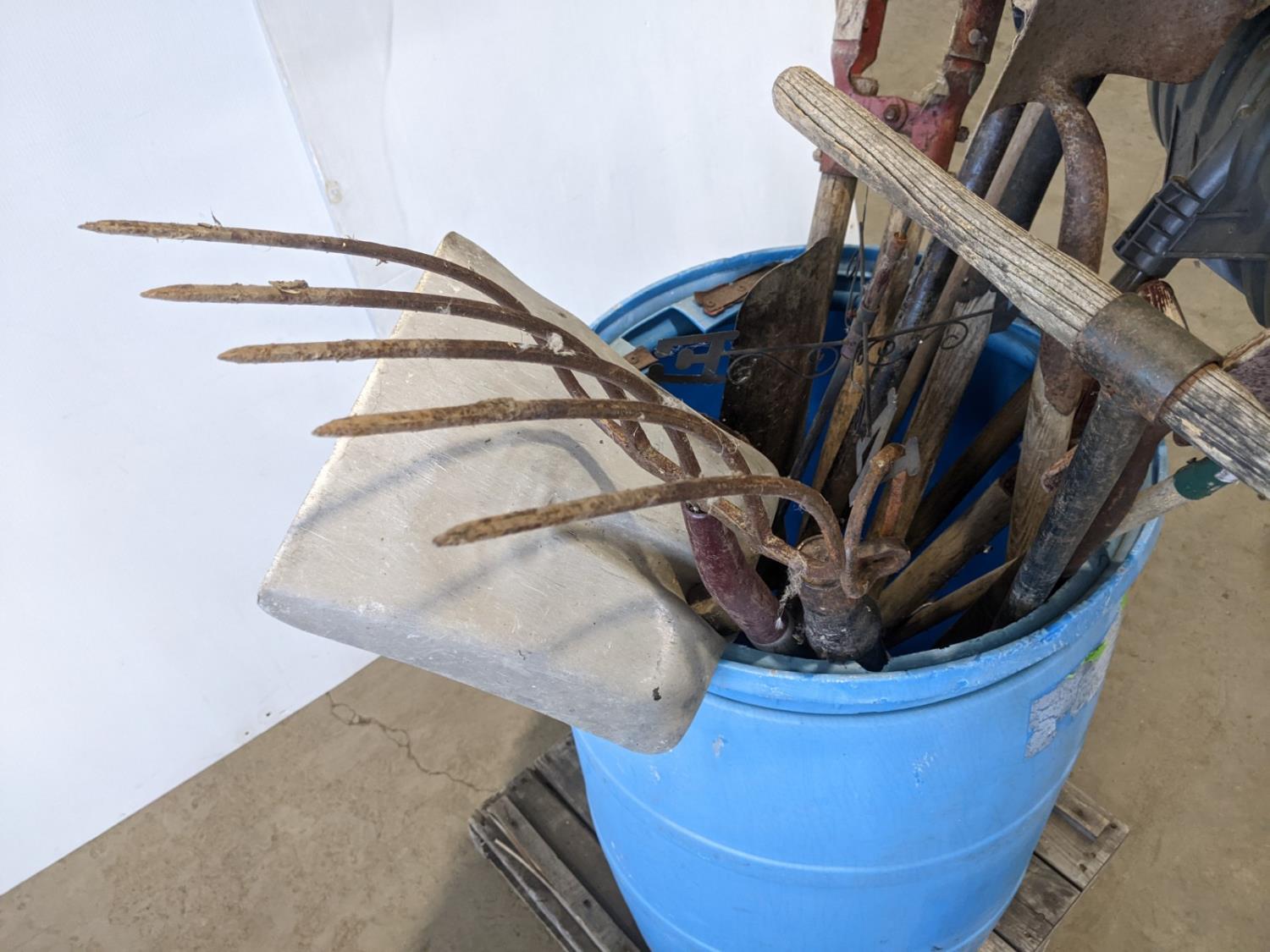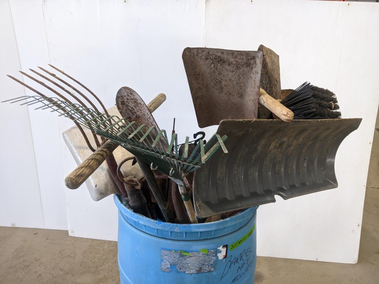 Shovels, brooms, rakes, pitchfork, post hole digger