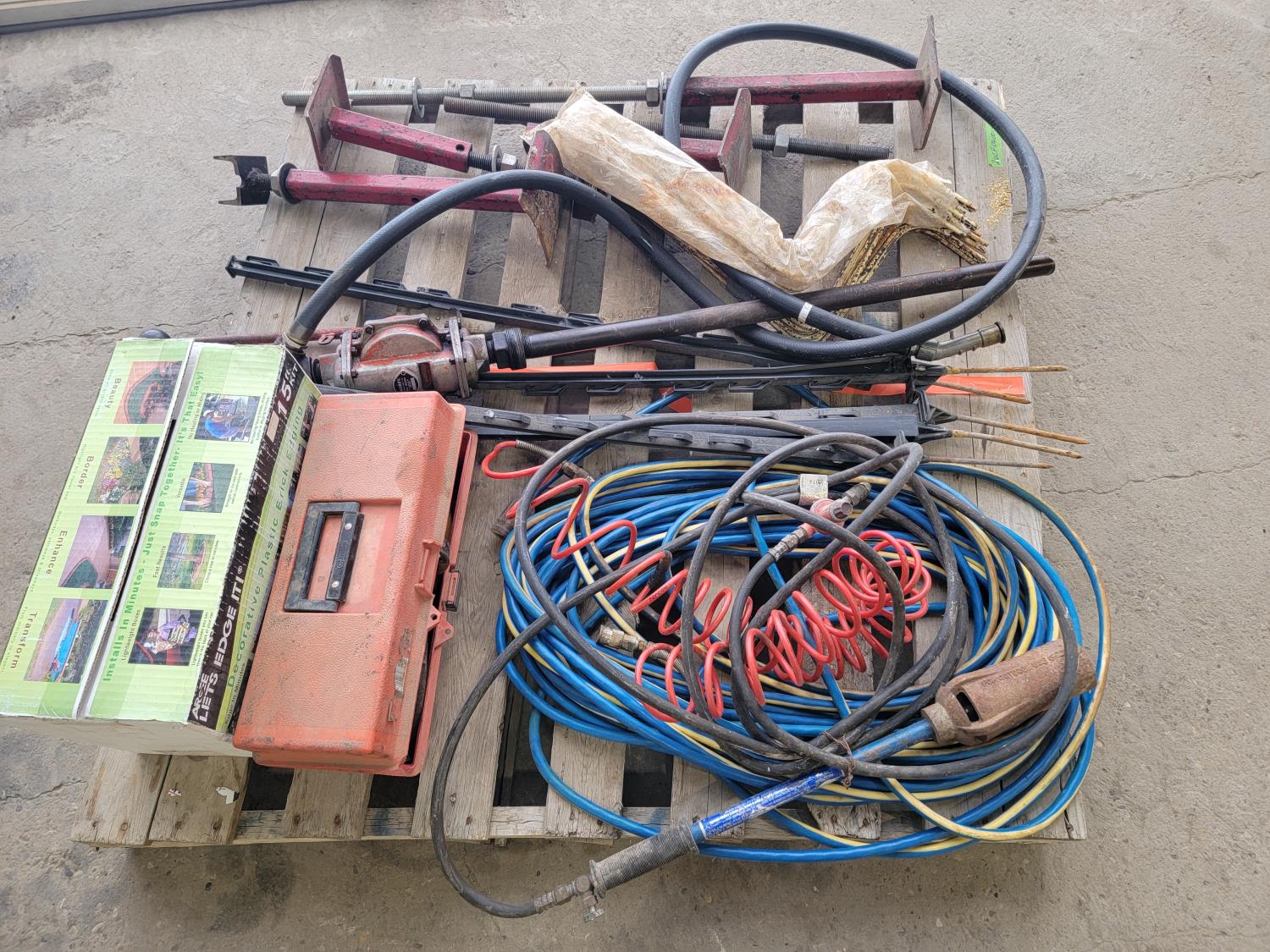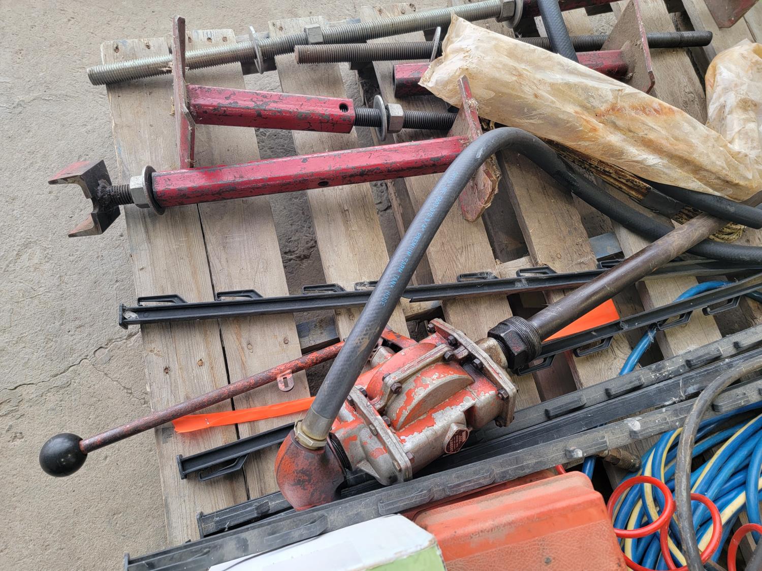 Fence holders, pipe stands, rake teeth, tiger torch, manual barrel pump