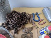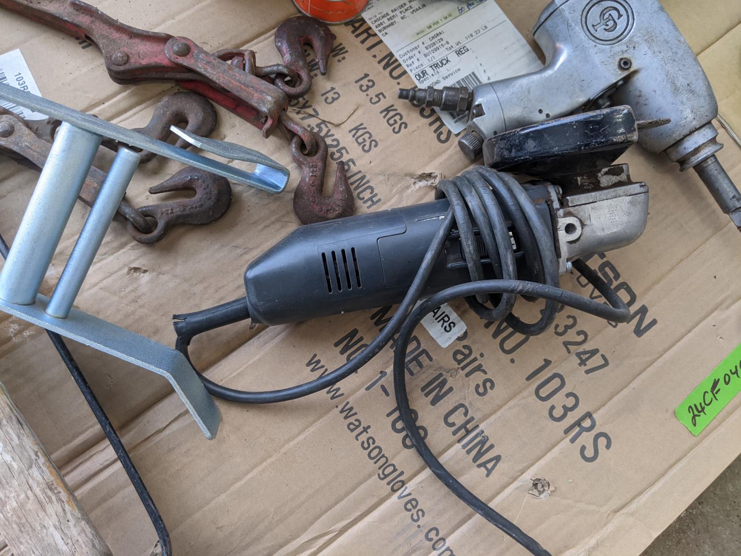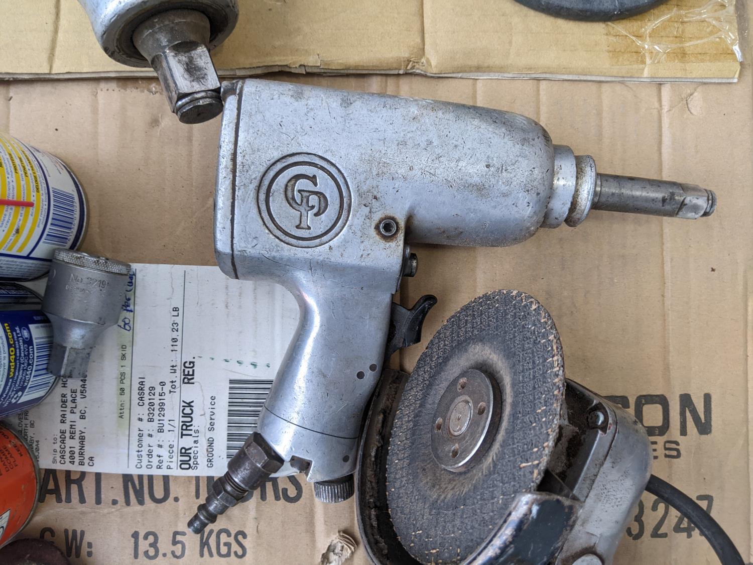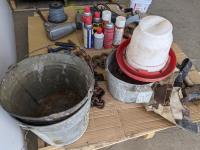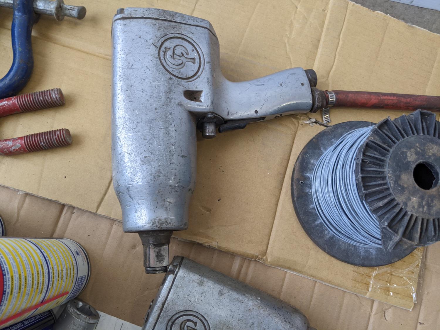 Metal pails, feeders, sledge hammer, strap winder, chain hooks, Chicago Pneumatic 3/4 inch drive air impact, Chicago Pneumatic 1/2 inch drive air impact